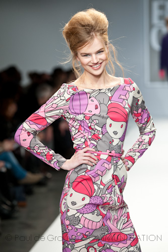 La novità di quest’anno sta proprio nel casual grey; senza abbandonare il colore o le originali stampe, Coveri introduce un blocco di sfilata molto chic che ruota attorno alle sfumature dei grigi. La nuance è declinata nel guardaroba di lui su giubbotti in pelle, montoni e super casual montgomery in felpa, da indossare sopra a pantaloni formali sorretti da vistose bretelle; ed in quello di lei su capi must come il cappotto illuminato da una pioggia di micro paillettes, vistoso e metropolitano.