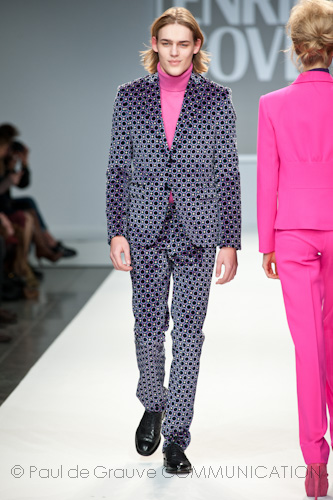 Dopo il blue mood, il gioco passa a lei e la palette arriva agli immancabili viola e fucsia. Il colore simbolo di Coveri tinge cortissime gonne plissettate o con due file di bottoni che riprendono il concetto del blazer maschile. Lui è ricoperto di velluto, in tinta unita o in stampe che ricordano la carta da parati degli Anni ’70, modellato su giacche fitted, da indossare con dolcevita abbinato o in netto contrasto.