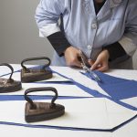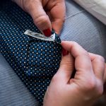Le nostre sete sono tagliate una ad una dalle nostre maestre sarte, qui nel laboratorio di Napoli. I vari pezzi tagliati sono poi assemblati. Si inserisce l’anima e si chiude la cravatta con una prima imbastitura che è poi eliminata dopo che la sarta ha provveduto, sempre in modo manuale, a rifinire il tutto con una cucitura invisibile. Una caratteristica, per le cravatte foulard, è che la parte retrostante alla punta frontale è foderata con lo stesso tessuto. Da sempre, per scelta, non foderiamo con un tessuto in tinta unita. Questo consente, anche laddove la cravatta dovesse muoversi e girarsi, di dare sempre un’immagine molto armoniosa.