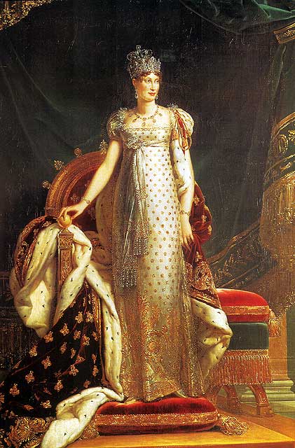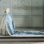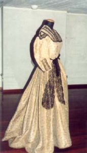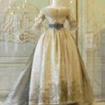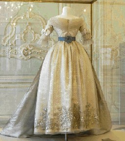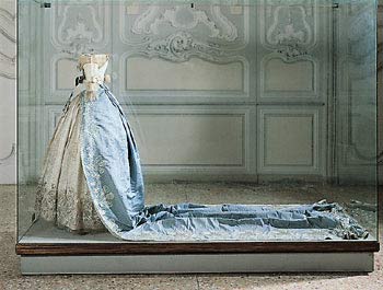 E’ invece un manufatto parigino di inizio ‘800 un abito con manto di gala della stessa Maria Luigia. L’intero abito è in tulle di seta color avorio decorato da mouches in lamé d’argento e foderato con raso di seta anch’esso in tinta avorio. E’ formato da corpetto e gonna distinti: il corpetto, chiuso posteriormente da una fila di ganci, presenta uno scollo a barca, fregiato di un tulle plissettato e strette maniche che partono basse ed arrivano al gomito, dove sono rifinite con due balze arricciate e soprammessi in tulle; la gonna è composta da tre teli di tulle pieghettati in vita e cuciti ad un nastro di seta, con chiusura a ganci posteriore. L’estremità inferiore della gonna è ornata da un ricamo in lamé d’argento a cornucopie in gruppi di tre e tralci di vite. Il manto, in seta marezzata azzurra, presenta un lungo strascico ed è allacciato in vita sul davanti. Lungo il perimetro è ripetuto il ricamo a cornucopie e pampini in lamé. Sul corpetto è posta una fascia trasversale in seta azzurra su cui è applicata la Croce di Gran Maestro dell’Ordine Costantiniano di San Giorgio in oro e smalto.
