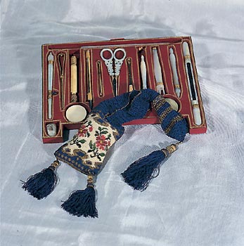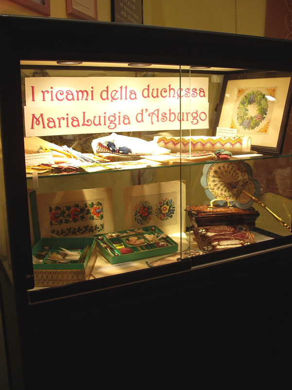 La duchessa, che amava ben vestire e seguiva con passione le vicende della moda, si cimentava spesso di persona in lavori di ricamo, ai ferri o all’uncinetto. Tra i suoi manufatti in mostra al Museo Lombardi possiamo citare un berretto circolare eseguito all’uncinetto in cotone verde e filo dorato (rimasto incompiuto; si conserva anche un residuo della matassina di filo utilizzata) e un altro berretto con la sommità tonda realizzata all’uncinetto a punto basso, con ciniglia blu e fili d’oro e d’argento, bordure in cotone lavorate a ferri e all`uncinetto. Merita una citazione speciale una borsetta realizzata all’uncinetto con fili di seta policroma e filo dorato, di forma allungata: subito al di sotto dell’apertura, la vera e propria tasca è ornata da un motivo a fiori su fondo bianco; la parte superiore della borsetta è realizzata con filo in prevalenza azzurro e maglia più larga, e presenta un elemento decorativo ad anello. La sommità è ornata da una nappina dorata ed azzurra, come le due, di minori dimensioni, che pendono dalla tasca. Vi è poi una bustina impreziosita da Maria Luigia col monogramma della figlia Albertina Sanvitale, in raso di seta leggermente imbottito, ricamata entro una cornice floreale in seta policroma, velluto, filo d’argento e perline su fondo nero.