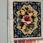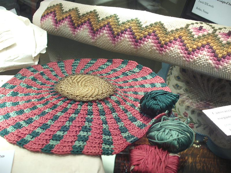 Sono numerosi poi i canovacci ricamati dalla duchessa, tra cui un panno in juta con ricamo floreale per una poltrona: l’articolo presenta un disegno a tralci di rose e foglie intercalati a nastri, parzialmente ricamato a punto croce in lana e seta di varie tonalità di verde, giallo, marrone, rosa e violetto. Il ricamo, incompiuto, era destinato ad abbellire una grande poltrona: lo schema, infatti, è adattato al cuscino, ai braccioli e allo schienale. Non mancano, inoltre, vari centrini eseguiti dalla sovrana, tra i quali uno circolare in seta realizzato all’uncinetto con un ornamento a grani policromi su una base color corda. Va citata anche una coltre battesimale ricamata dalla duchessa per la figlia Albertina nel 1817: di forma rettangolare, la copertina è in seta rosa, ha bordi ricamati e reca ulteriori ricami angolari a motivi vegetali stilizzati, uguali per gli angoli opposti, in filo d’argento e lamè di platino. Realizzati da Maria Luigia sono anche dei tappeti da tavolo con fantasie floreali ed uccelli: uno in lana nera con frange policrome presenta splendide figure ricamate in seta e perline.