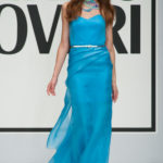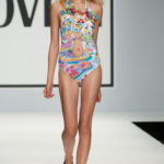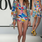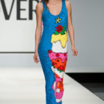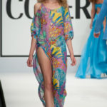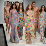 Attraverso elementi di continuità – leggere bordure in maglia a strisce arcobaleno – si passa ad esplorare il mondo sottomarino. La seconda stampa, a base rosa e turchese, reinterpreta la flora marina dei fondali. Conchiglie, alghe e coralli decorano caftani femminili e gli immancabili abitini, mentre per l’uomo impreziosiscono cravatte o cappelli – che non vengono indossati, ma sfilano invece portati a mano, o infilati distrattamente nelle tasche posteriori dei jeans – accendendo completi e camicie declinati nelle sfumature più tenui dell’azzurro.