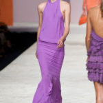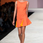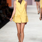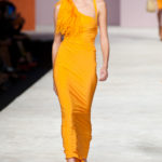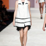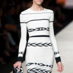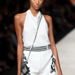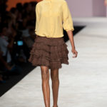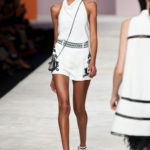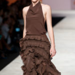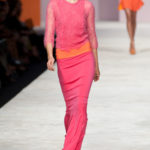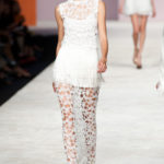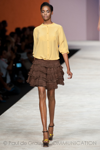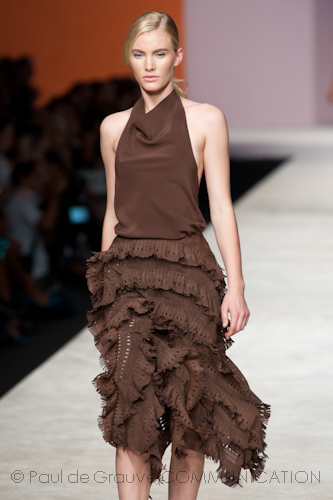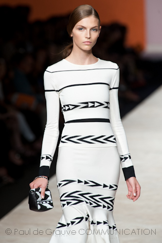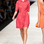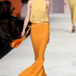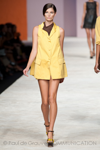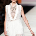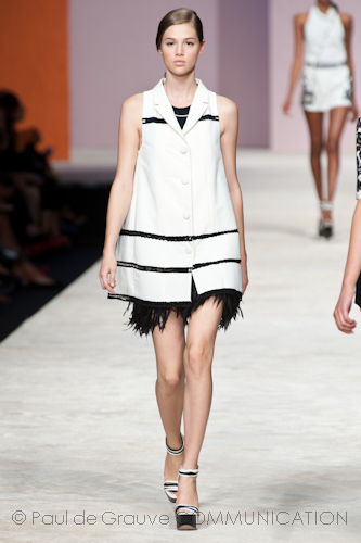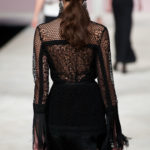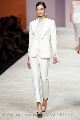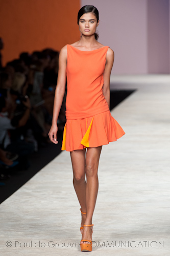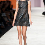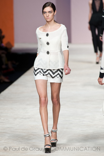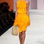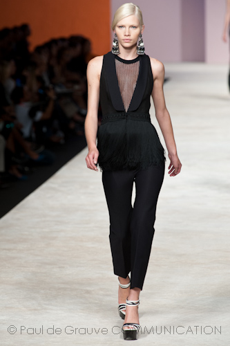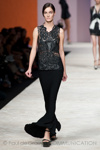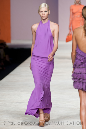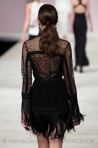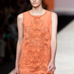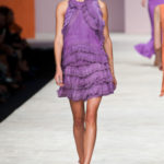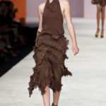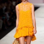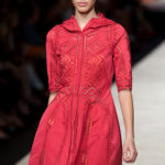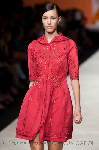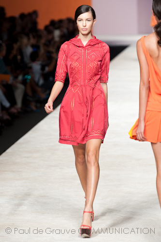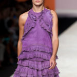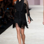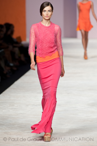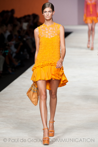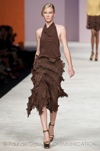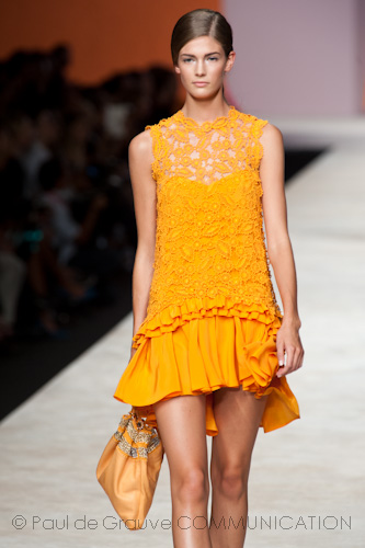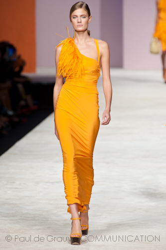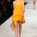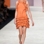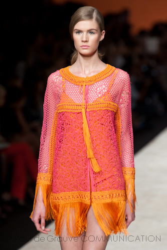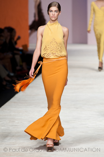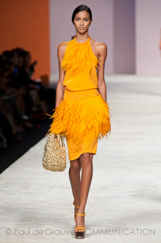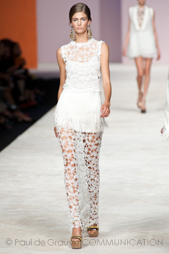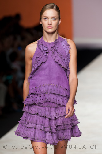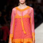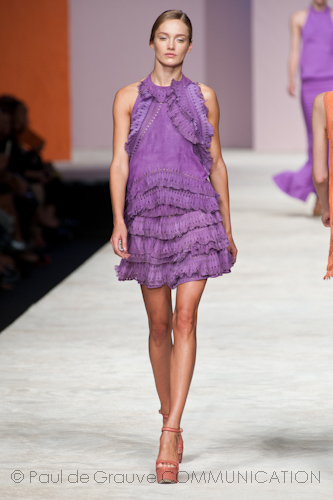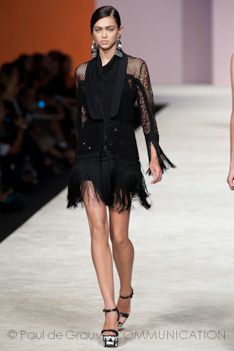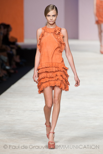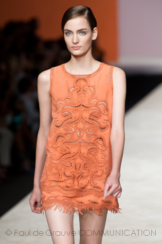 La sfilata si apre a tinte forti: colori accesi, caldi, avvolgenti. Arancio, viola, fuxia, giallo e corallo si declinano nei mini dress con dettagli sfrangiati o decorati con arabesque, realizzati in pelle, in camoscio e in seta. Piume di organza fatte a mano, nappe e frange ondeggiano a ogni passo, dando vita a sinuosi movimenti. In passerella anche abiti lunghi con ricami macramè, stretti e seducenti, le cui illusioni di vedo-non vedo ammiccano sia al giorno che alla sera. E ancora shorts, gonne lunghe a vita bassa, maglie mohair doppiate a rete, pizzi e decori a creare sensuali giochi di trasparenze. Colpisce, tra un abito e l’altro, la presenza di un meraviglioso parka color fragola con cappuccio, che non perde la sua femminilità grazie alla coulisse strettissima ad evidenziare la vita.