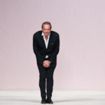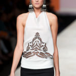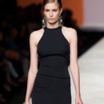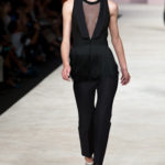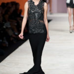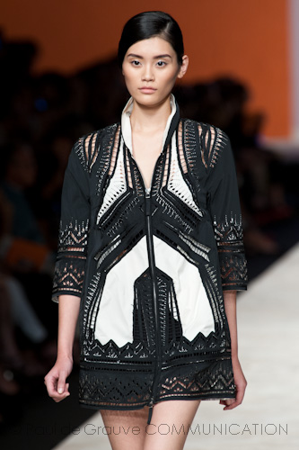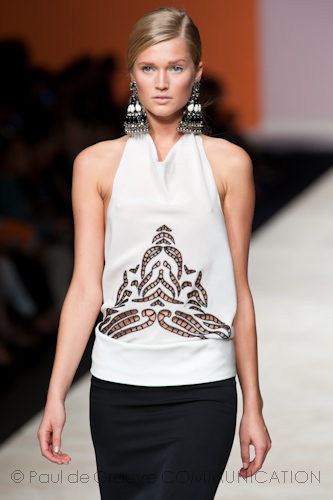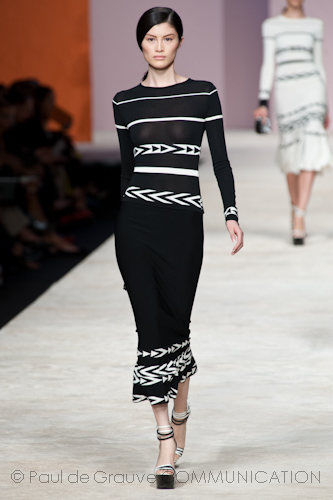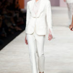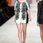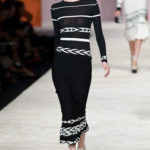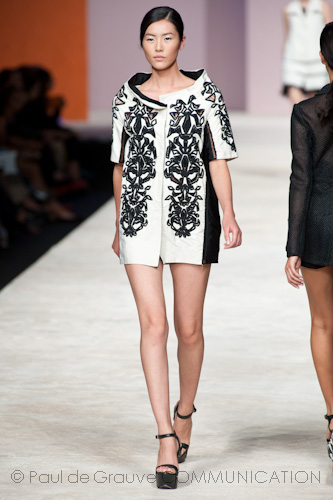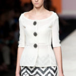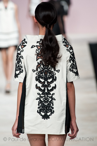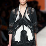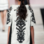 Nella seconda parte della sfilata solo bianco e nero insieme a disegnare motivi geometrici dalle linee nette, che tagliano orizzontalmente la figura negli abiti longuette – una, due…otto volte, oppure complicati disegni floreali su una casacca dallo scollo morbido e dalle molteplici occasioni d’uso. Bianco e nero anche separati, dove il monocromatico è spezzato da trasparenze, ricami, assenze, vuoti.