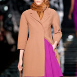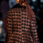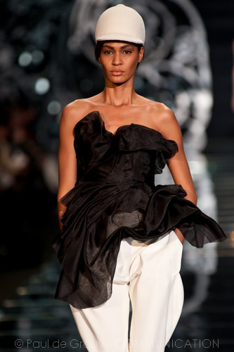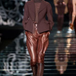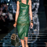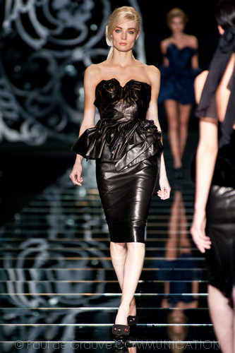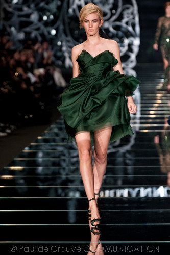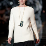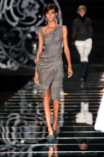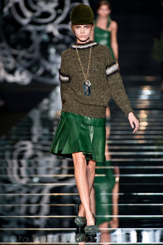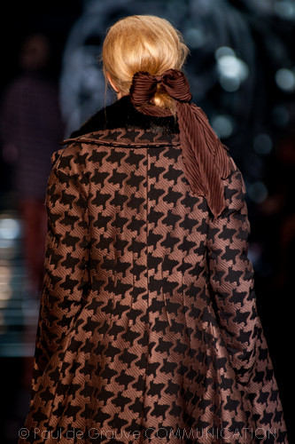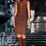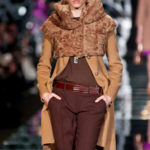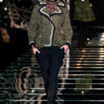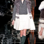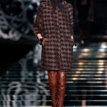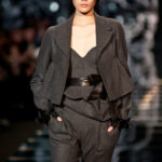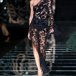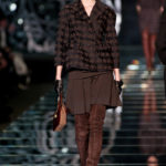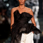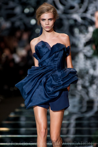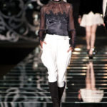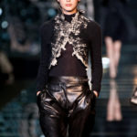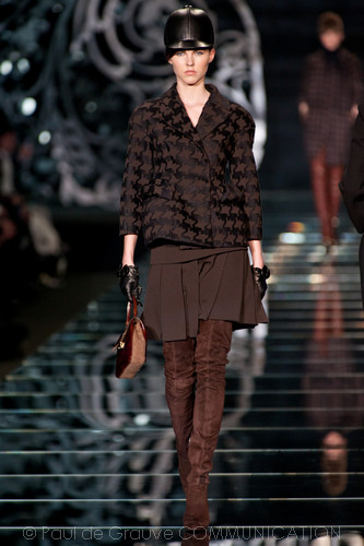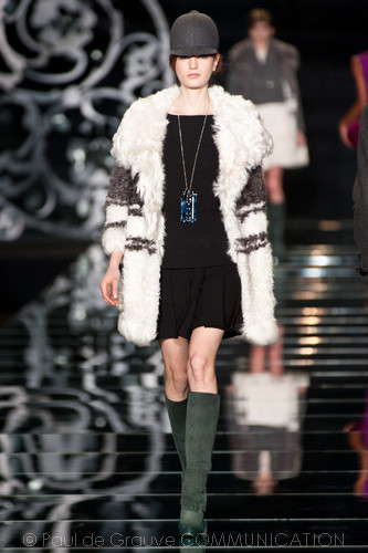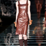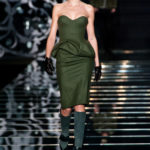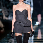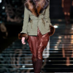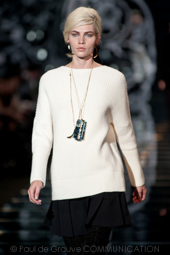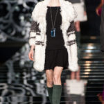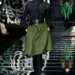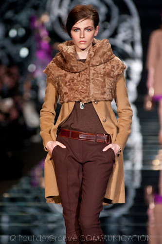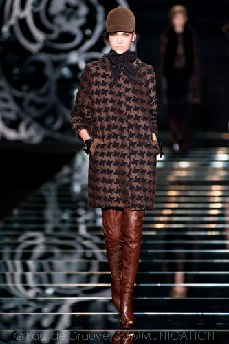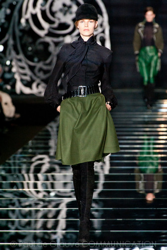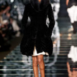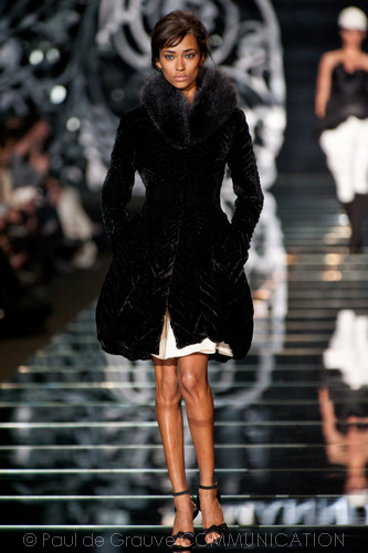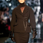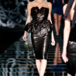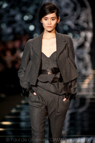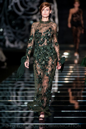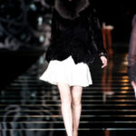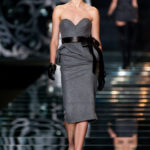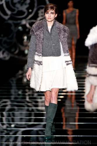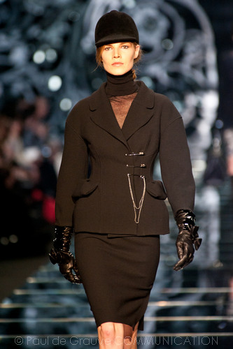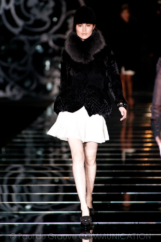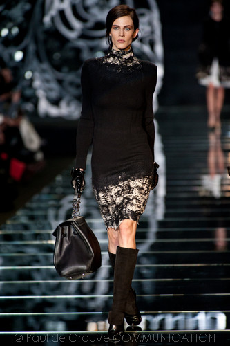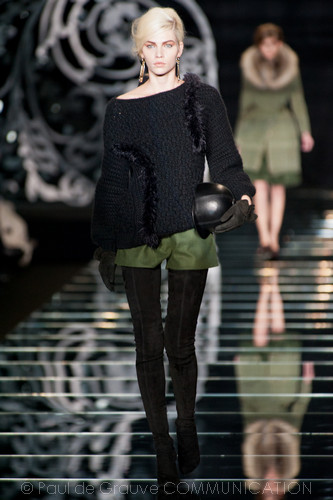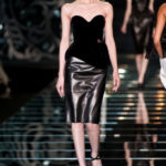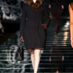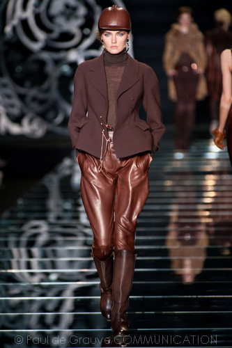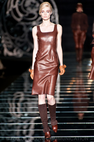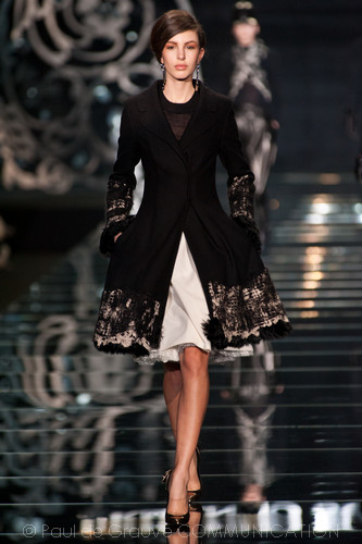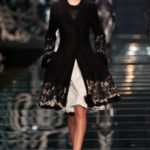 Per il giorno abiti longuette con seducenti bustier in neoprene – protagonista indiscusso di questa fashion week – o in crespo avvolgono la figura enfatizzandola con giochi di geometrie o plissé. Corte giacche sciancrate in lana cotta o crespo, cappotti dal taglio sartoriale con colli importanti, uno splendido crespo con disegno macro pied-de-poule, giacche dai tessuti maschili arricchite da morbidi colli in pelliccia, e ancora dettagli e tessuti dello stile militare reinterpretati nel linguaggio della couture: i capispalla sono pesanti e rigorosi, ma la femminilità si ritrova nella leggerezza e impalpabilità dello chiffon delle camicie.