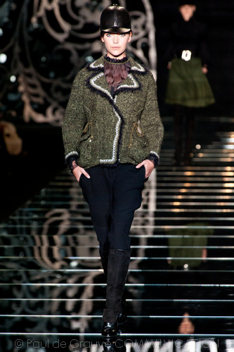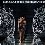 Un alto cancello nero in ferro battuto, a formare ghirigori a metà tra fiaba e racconto gotico; il suono delle campane, il rumore di zoccoli. Il richiamo alla campagna inglese, fatta di boschi rigogliosi e lords a cavallo, è inequivocabile. La donna Scervino trae ispirazione dal mondo equestre, dalla contea dell’Hampshire, ma anche dalla Venezia settecentesca del Rococò, con i suoi stretti corpetti e le ampie crinoline.