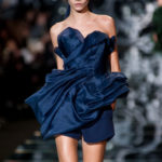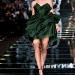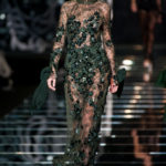 Per la sera mini dress bustier in velluto creano volumi e geometrie giocando con leggeri strati d’organza ancora in verde, nero o in un elegante blu notte. In chiusura due meravigliosi abiti lunghi: il primo è verde bottiglia, e con le trasparenze del pizzo e il fluttuante chiffon sembra raccontare la storia di una fata dei boschi; il secondo è un elegantissimo nero con trasparenze di pizzo/paillettes, monospalla con spacco vertiginoso, ad esaltare la figura femminile e una sensualità che, seppur audace, non è volgare.