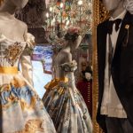 La seconda sala è dedicata all’arte della lavorazione del vetro veneziano. L’allestimento si snoda tra specchi e lampadari di alta caratura artigianale, creazioni pensate per riflettere i minuziosi dettagli di ricami e cristalli che arricchiscono gli abiti presentati al loro fianco.