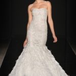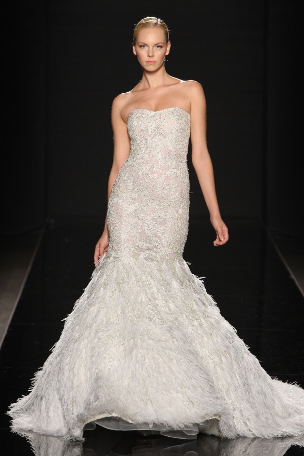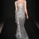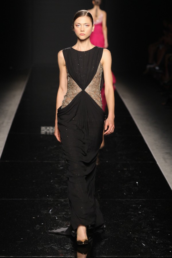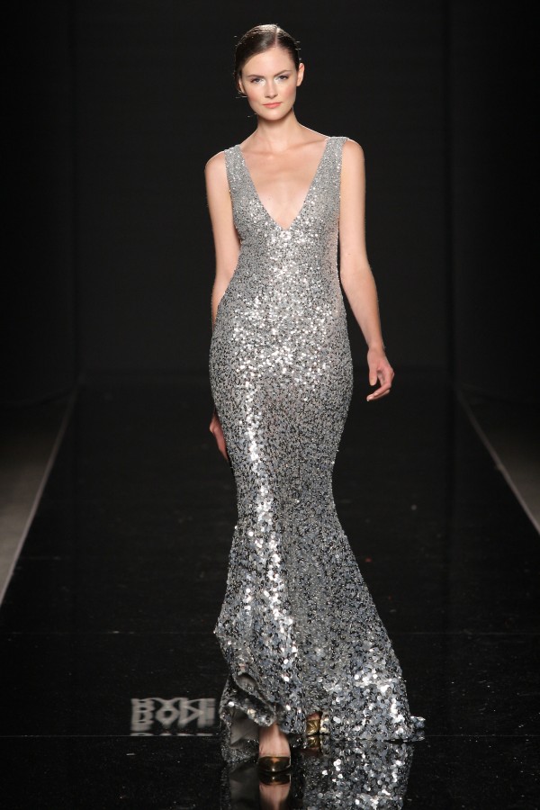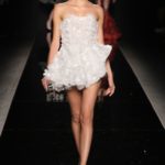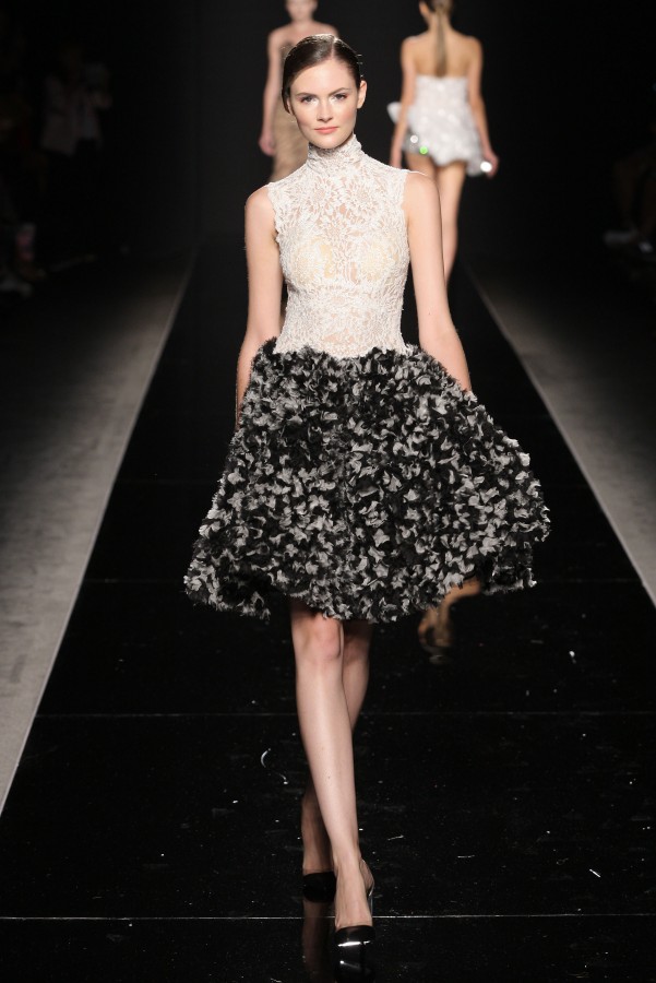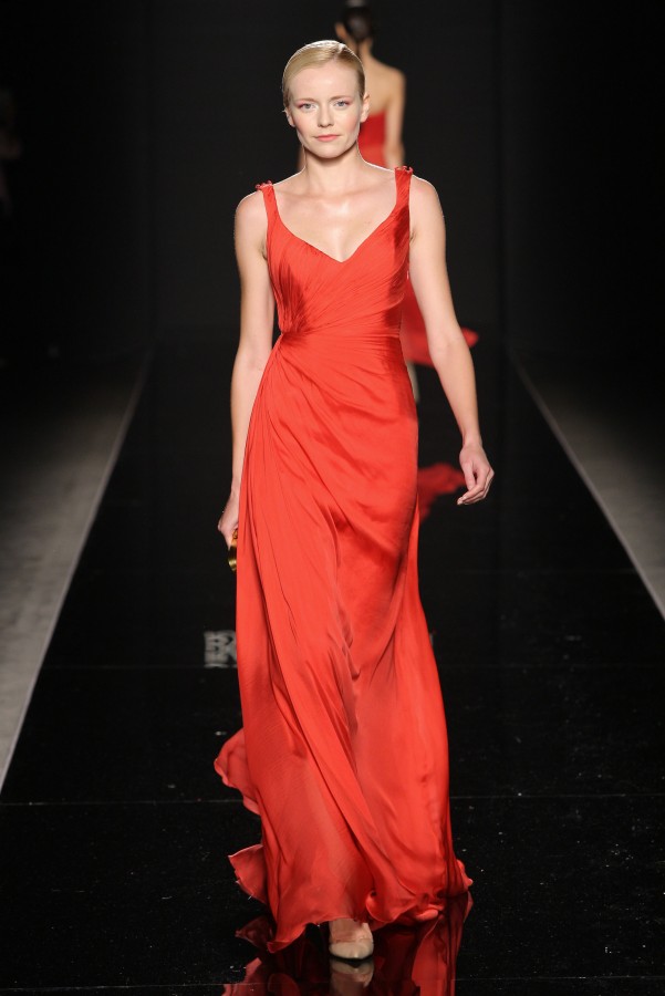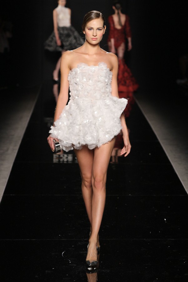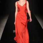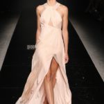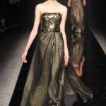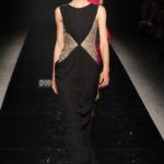 Gli abiti più belli sono quelli dal tenue colore rosa, corpino bustier ricamato vita sottolineata e cascata di georgette e linee sinuose bello l’abito che chiude la sfilata bianco, da sposa, linea sirena, decorato sulla gonna e sul lungo strascico con piume. Interessanti gli abiti colore brunito corpino con applicazioni dure dello stesso colore. Scenografici gli abiti rossi, come quello con il grande fiore sulla spalla. Decisamente poco eleganti i due abiti rosso e nero.