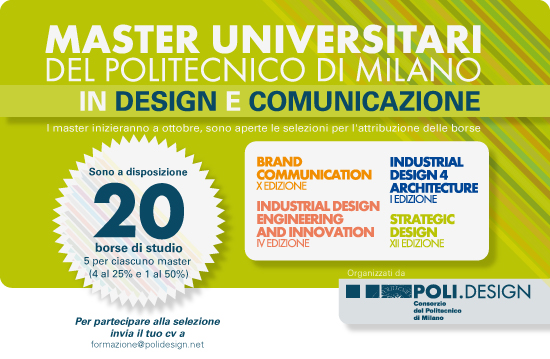 Partiranno il prossimo autunno, presso il politecnico di Milano, quattro master universitari in design e comunicazione, dai temi: Brand Communication, Industrial Design Engineering and Innovation, Strategic Design e Industrial Design for Architecture.