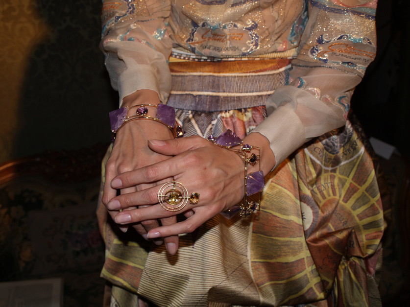 Sfere armillari luglio 2009 inaugura una collaborazione con Gattinoni: per accompagnare abiti di una collezione siderale di Guillermo Mariotto, Gianni De Benedittis cerca l’ispirazione nel modello di sfera celeste inventato nel 250 a.c., cerchi concentrici graduati che permettevano di studiare il movimento degli astri. Se Sfere armillari si è fatta notare per l’originalità, design, preziosità, deludente, è stata deludente Palingenesi di gennaio 2010 per accompagnare ancora gli abiti Gattinoni firmati da Guillermo Mariotto. La clessidra, leitmotiv della collezione, si è rivelato un modello ingombrante e poco duttile per diventare oggetto portabile sotto forma di anello o collier. Anche la collezione Segnali di Lusso, oggetti atti ad indicare strategie per viaggiare sulle strade dei sentimenti, 2009 ci ha lasciati perplessi. Non l’abbiamo “presa sul serio”, l’abbiamo giudicata un divertissement .