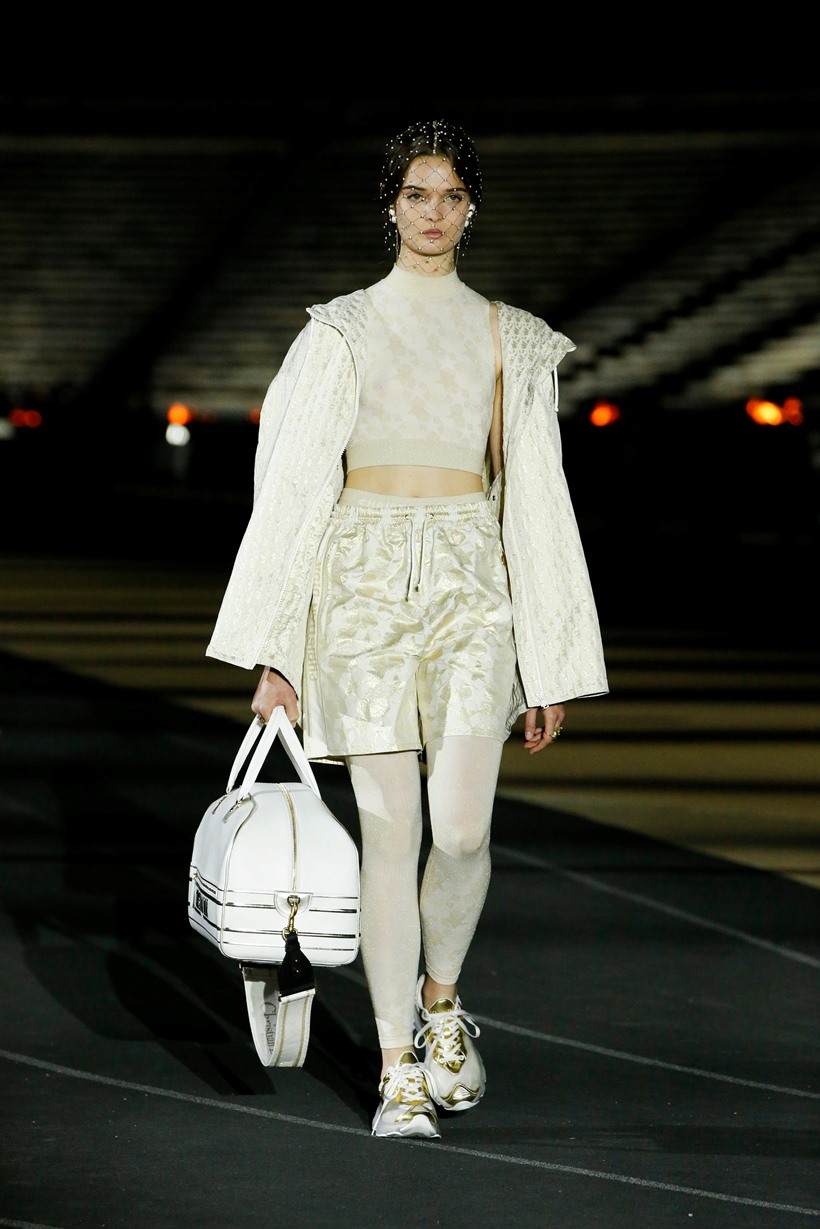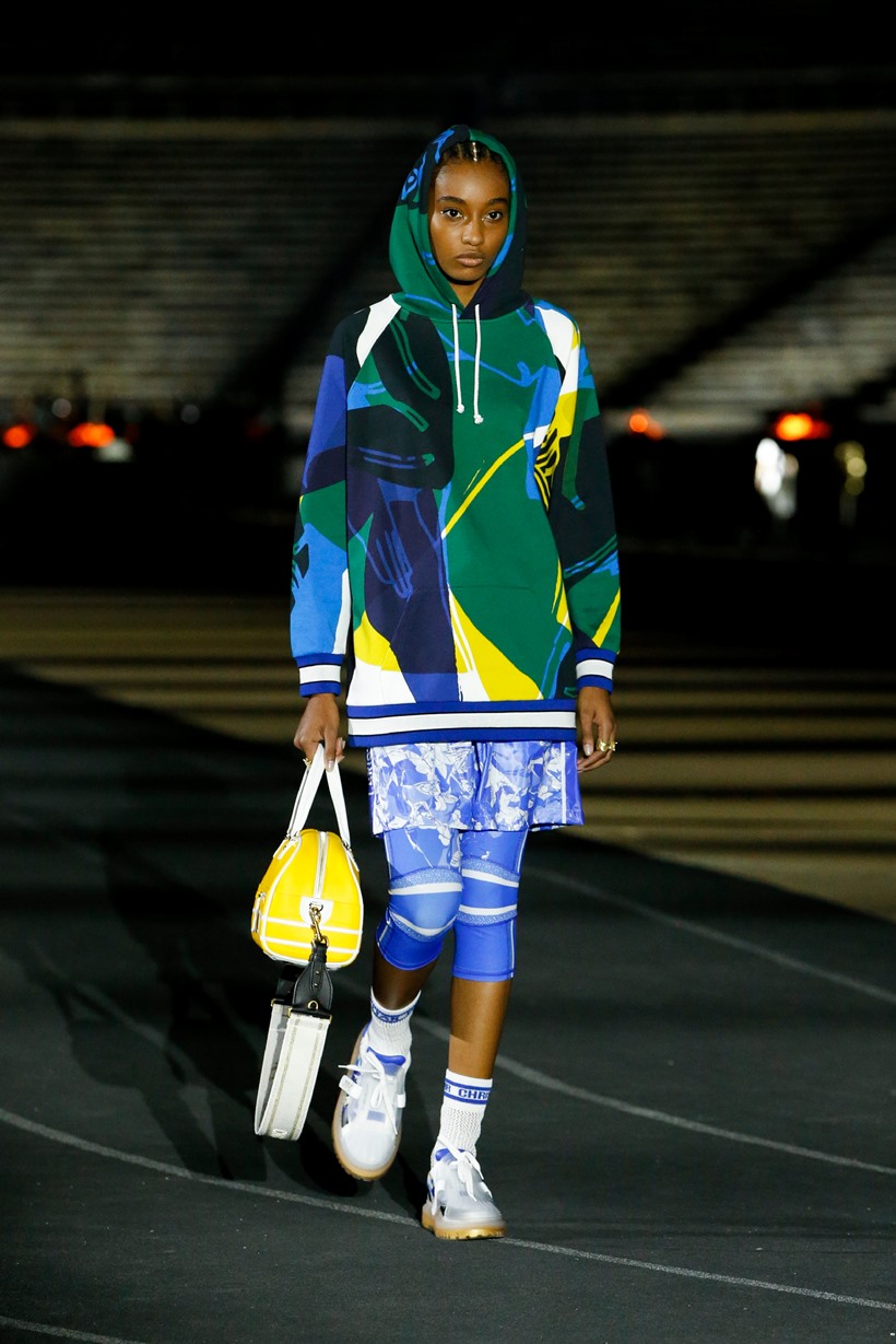 L’idea dello street wear si riversa sulle “divise” ginniche ed atletiche di nuova generazione che si distinguono per trame jacquard dai colori quasi acidi, motivi optical, pied de poule incisivi e grafiche dal sapore antico ma rigorosamente attuali. Per queste ultime la Chiuri si è avvalsa della collaborazione di Pietro Ruffo che con le sue “letture visive e semantiche” ha definito in modo ancora più marcato l’idea di un pragmatismo moderno della moda.