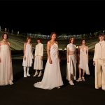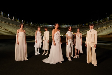 L’allestimento scenico della sfilata è quello “olimpico” dello stadio Panathinako di Atene. Un teatro meraviglioso che riecheggia i fasti antichi e le divinità leggendarie. Perfetto spettatore della discesa sulla terra delle nuove muse.