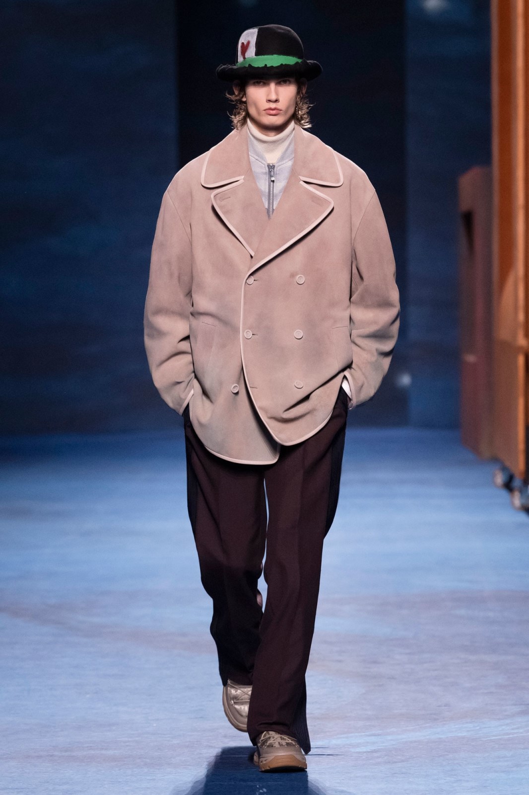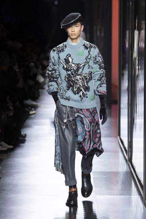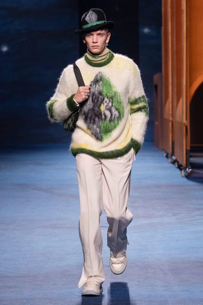 Per le fantasie dei pullover in lana spazzolata e delle camicie fluide la maison si è affidata alle visioni dal quotatissimo pittore Peter Doig, definito da tutti il nuovo Gauguin scozzese. Mentre per i baschi francesi e i berretti invernali, si è appoggiata alle mani geniali del “cappellaio matto” e pop Stephen Jones.