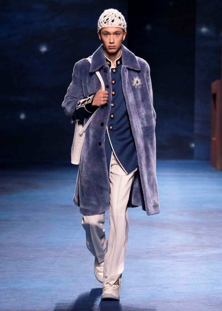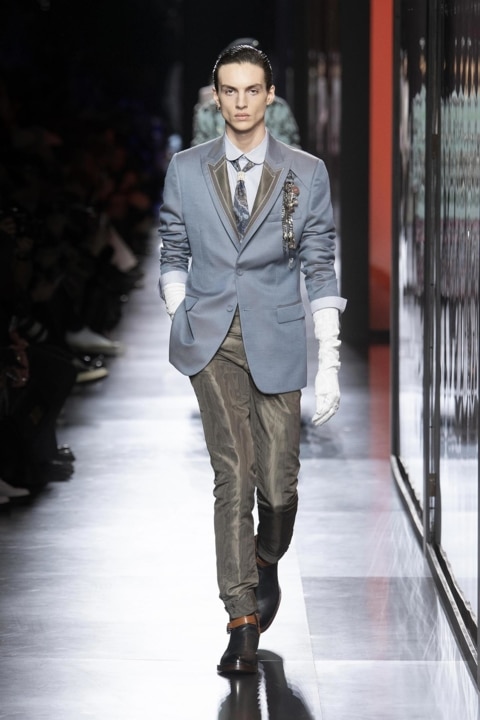 Risalta su tutto l’outfit a strati ma in particolar modo la giacca da nobile soldato con abbottonatura alta e collo alla coreana. Abbiamo assistito ad una vera e propria parata di ufficiali senza mostrine ma con al seguito lussuose spille a medaglia realizzate per l’occasione dalla famossissima influencer Yoon Ahn – oramai affermata direttrice del design di gioielli Dior Homme.