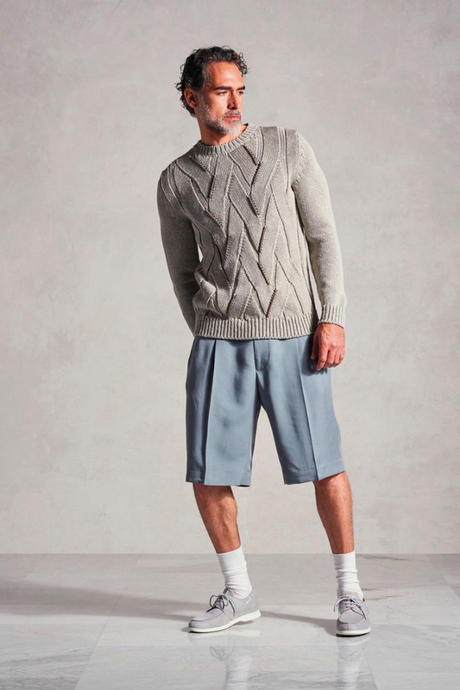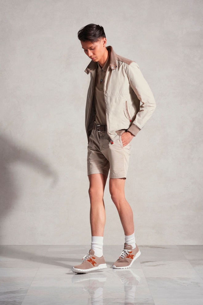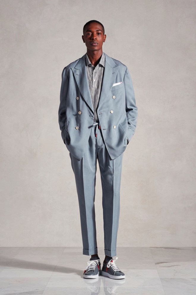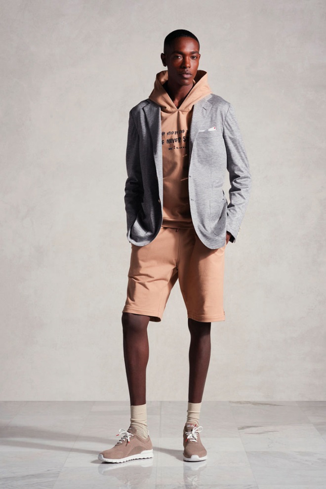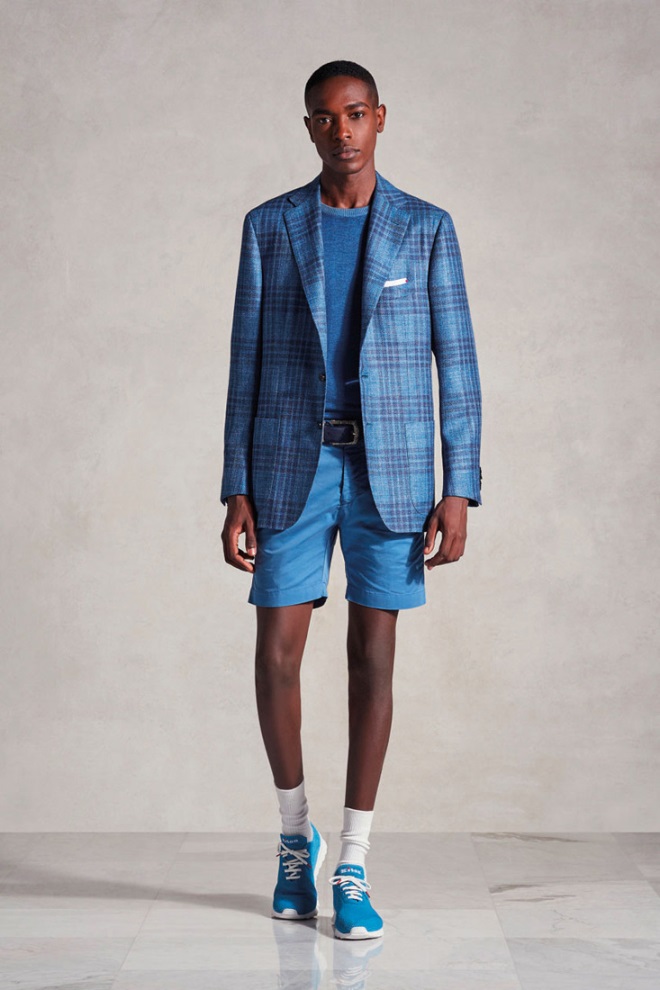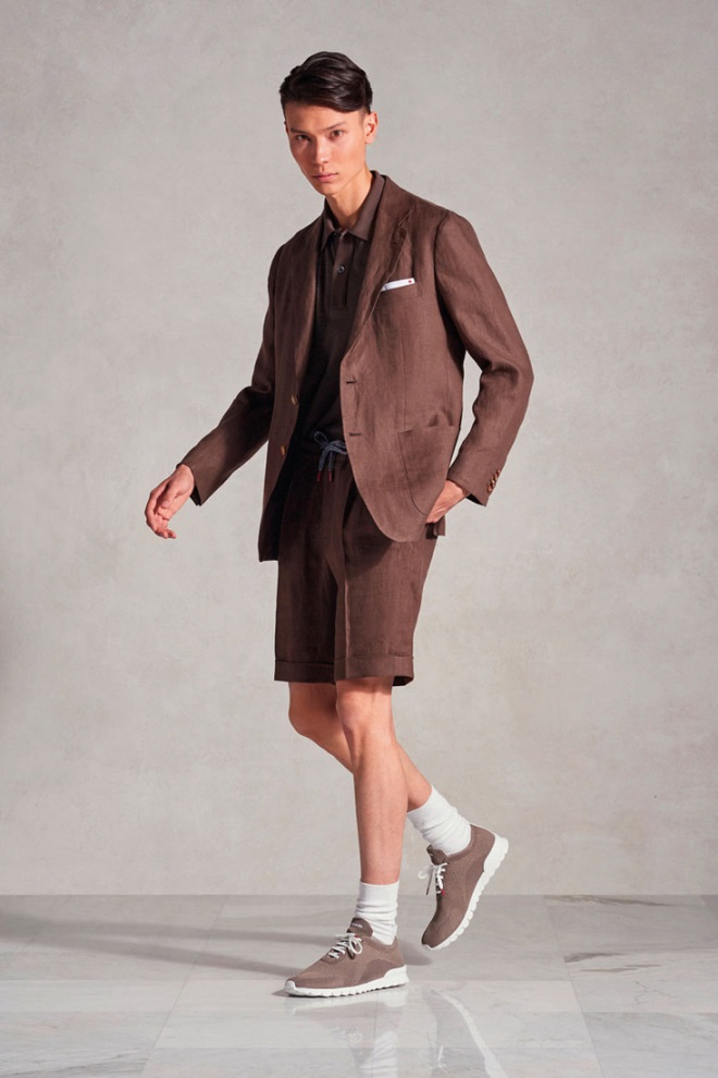 Kiton non rinuncia alla sua tradizione. Ciò che ci mostra è perfetto. Anche i capi più formali non perdono di raffinatezza nell’acquisire una nuova, più fluida modernità, come ad esempio i pantaloni del doppio petto in seta lavata che hanno elastico o coulisse in vita; oppure i completi con pantaloni corti, i bermuda, così inusuali alle nostre latitudini.