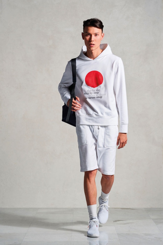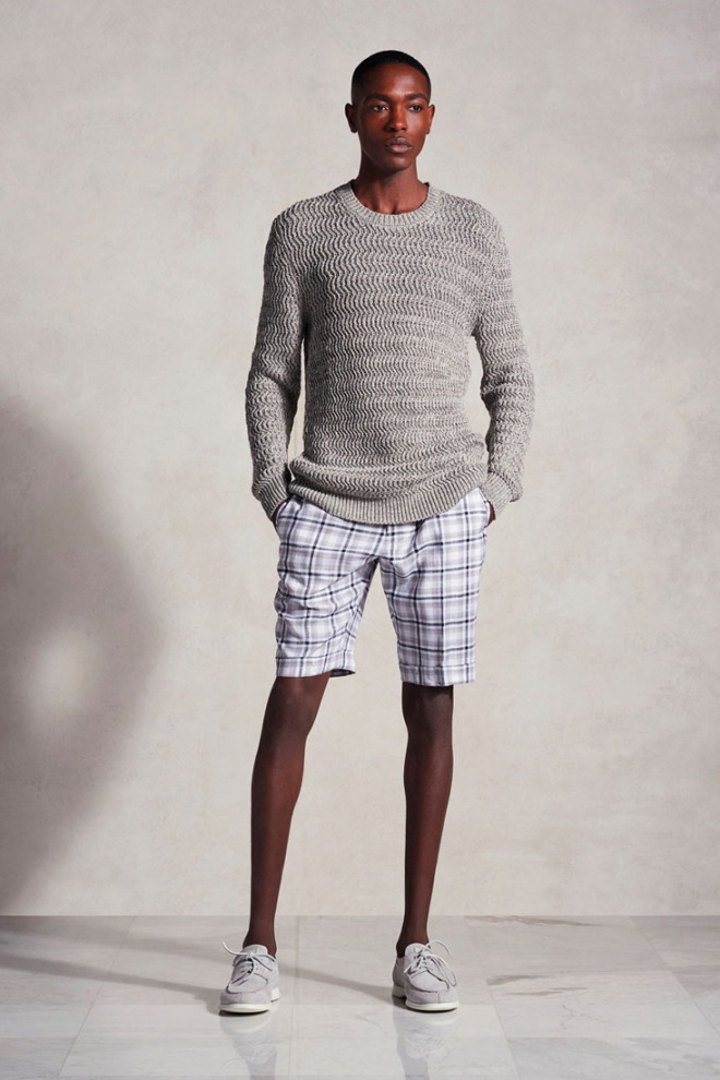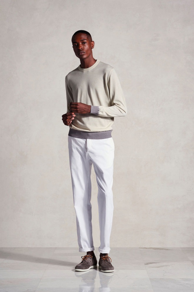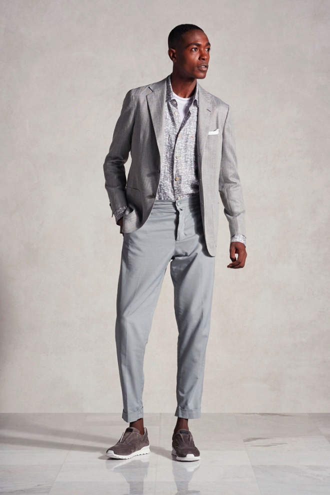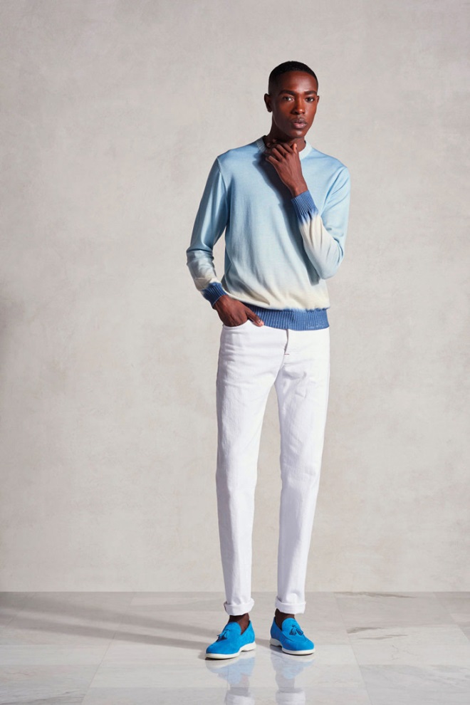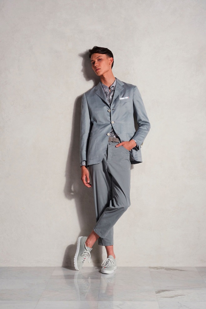 Kiton non rinuncia alla sua tradizione. Ciò che ci mostra è perfetto. Anche i capi più formali non perdono di raffinatezza nell’acquisire una nuova, più fluida modernità, come ad esempio i pantaloni del doppio petto in seta lavata che hanno elastico o coulisse in vita; oppure i completi con pantaloni corti, i bermuda, così inusuali alle nostre latitudini.