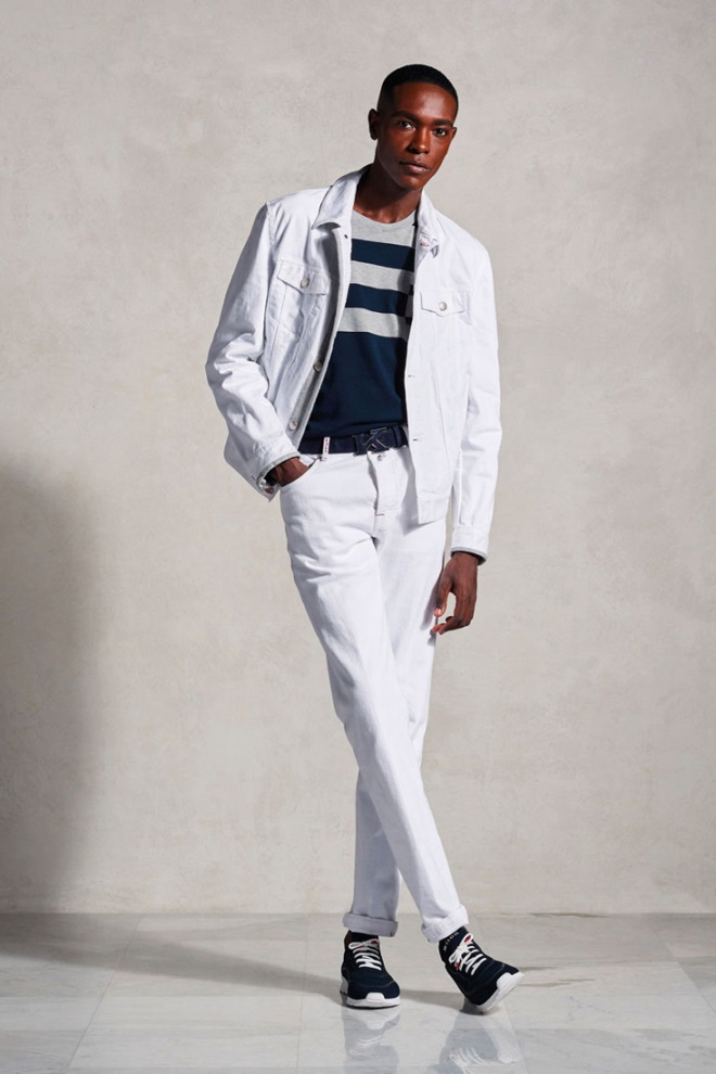 La palette è pacata fatta di tinte unite -bianco, grigio, marrone e il blu signature- utilizzate in tutte le loro sfumature e il nero; poche le fantasie, soprattutto rigate, in prevalenza per i pantaloni.