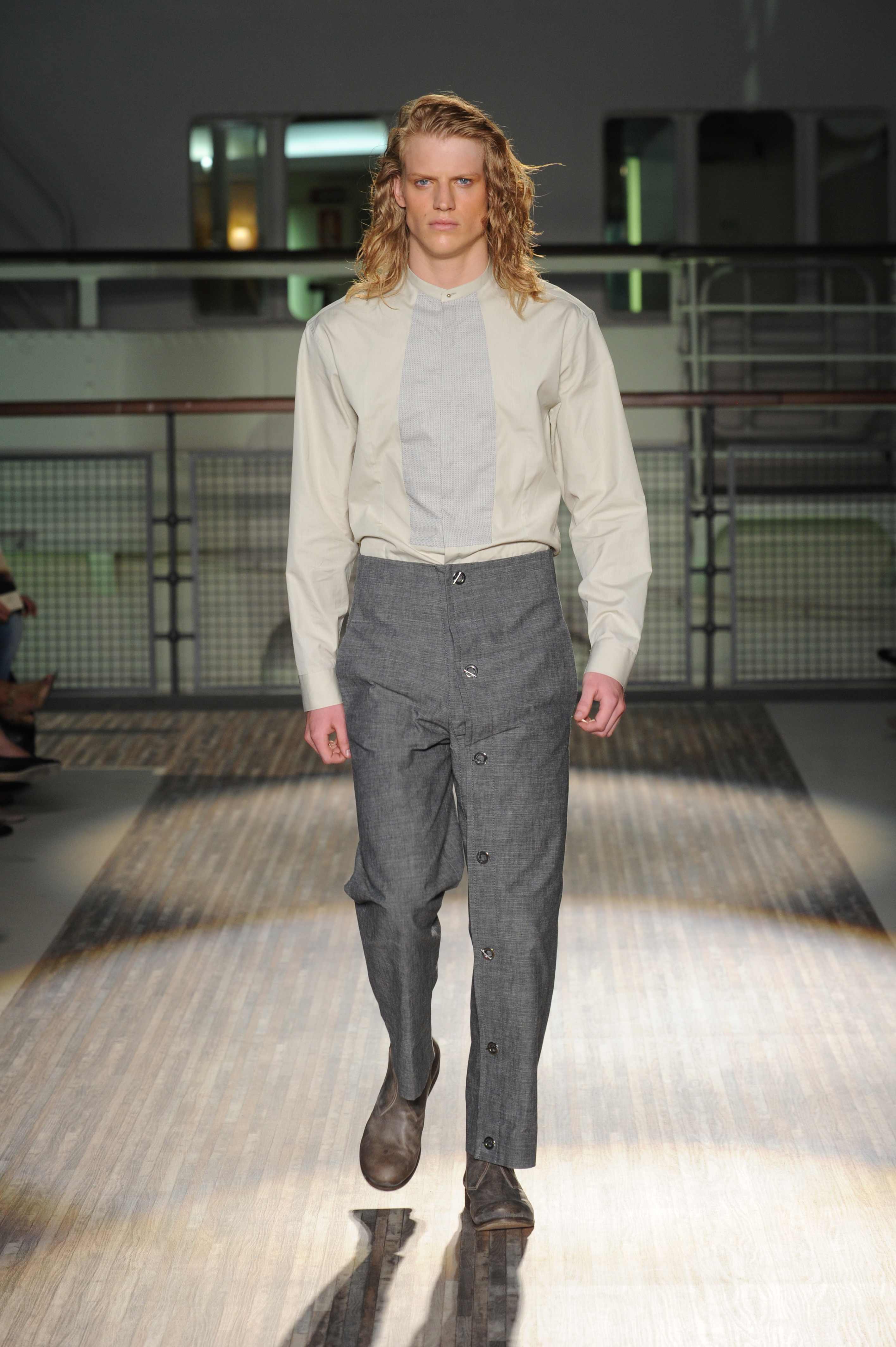 Poche le camicie, a vantaggio di bluse e t-shirt abbinate talvolta a pantaloni che rigettano la classica chiusura, per lasciare spazio ad una serie di grandi bottoni che percorrono l’intera lunghezza della gamba.