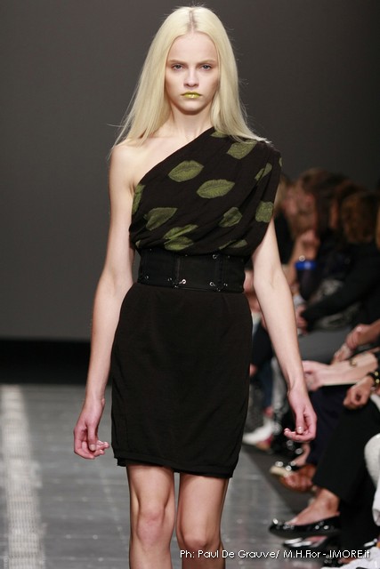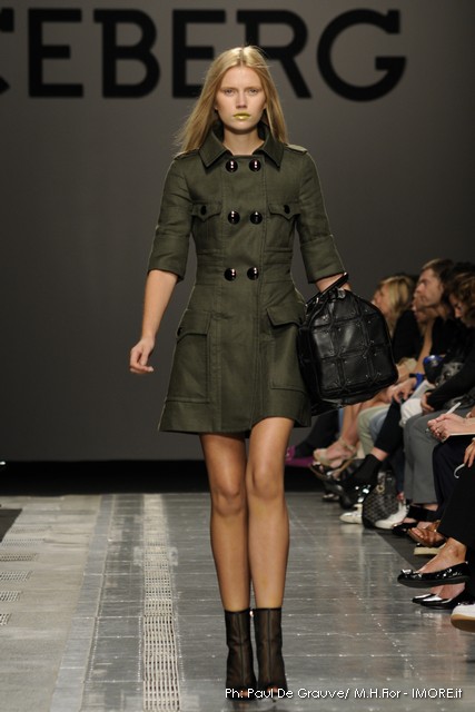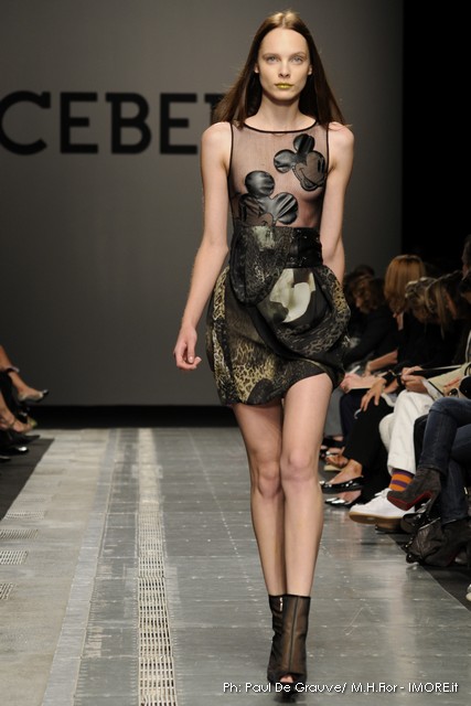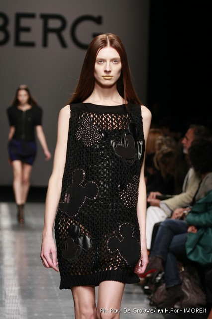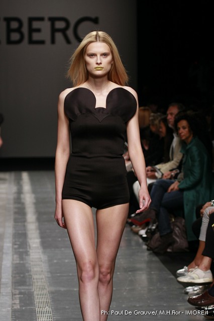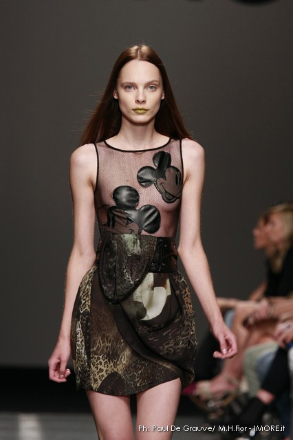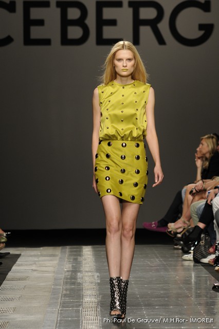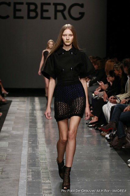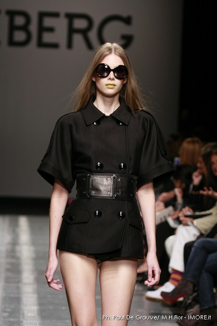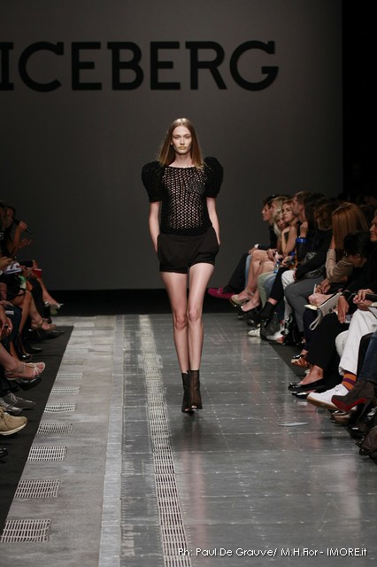 Topolino, riprodotto ossessivamente sui capi anche di maglia o a rendere meno audaci le trasparenze, diventa ispiratore di una silhouette surreale dove le orecchie del personaggio disneyano costruiscono le spalline alte e piatte delle giacche, disegnano nuovi profili su shorts e tubini o sulla scollatura del tubino bustier. Un divertissement, che smorzato dal tono enfatico proprio della sfilata, può senza dubbio trovare posto e rendere giovane e ironico un capo Iceberg.