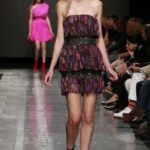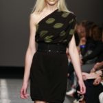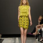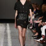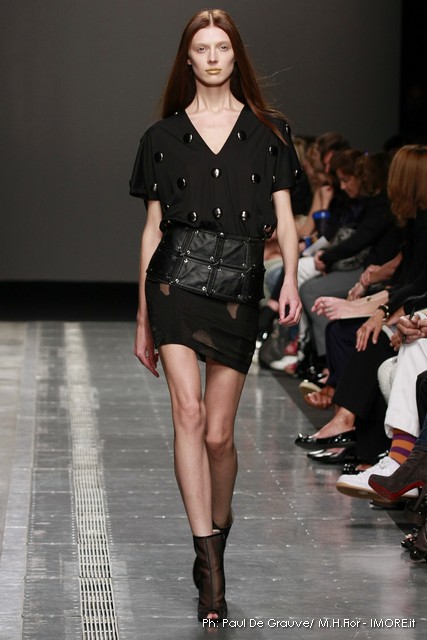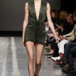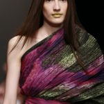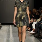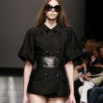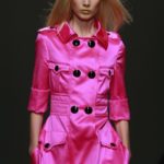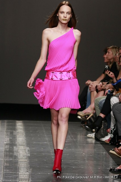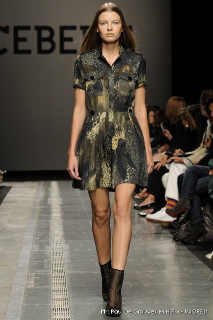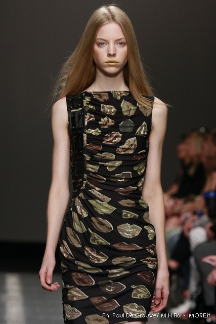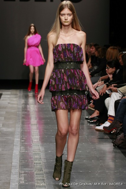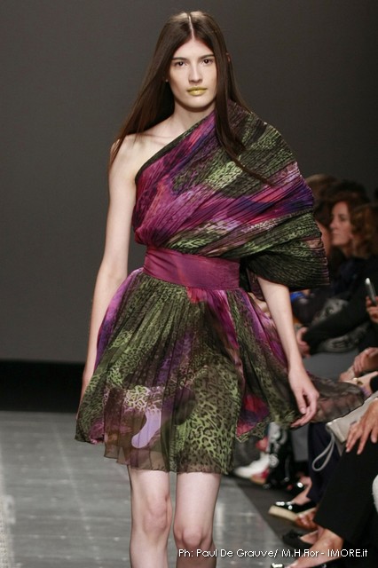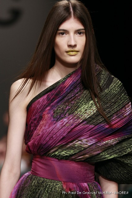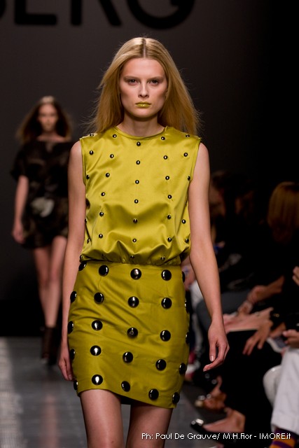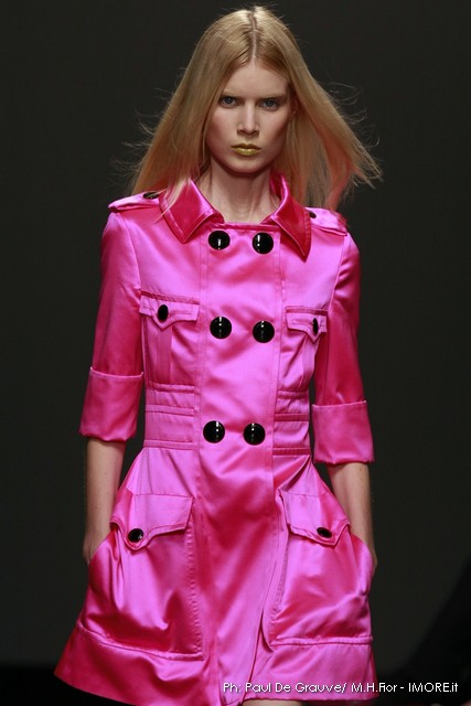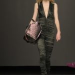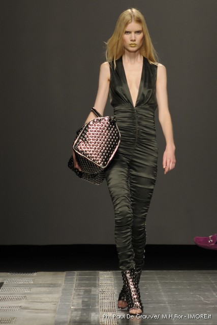 Ecco altro motivo ricorrente nella collezione: l’utilizzo delle borchie di diametro diverso, sui tessuti a fare effetto pois e poi sui capi in pelle, sui giubbini a intarsi; sul trench corto maculato, rosa shoking o verde, che è quasi una sahariana lunga, per sostituire i bottoni. Borchie anche piccolissime su una morbida blusa; borchie sulle baschine delle gonne; fili diagonali di piccole borchie per decorare la gonna dell’abito drappeggiato, stampato in parte maculato verde, in parte spennellato di rosa. E poi sugli accessori, sulle grandi borse, sulle alte cinture.