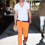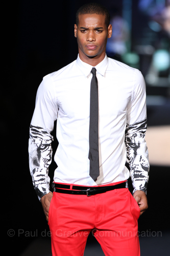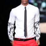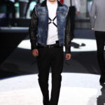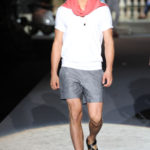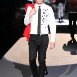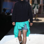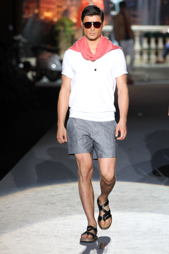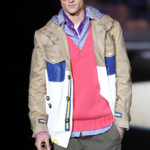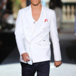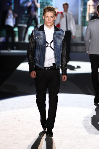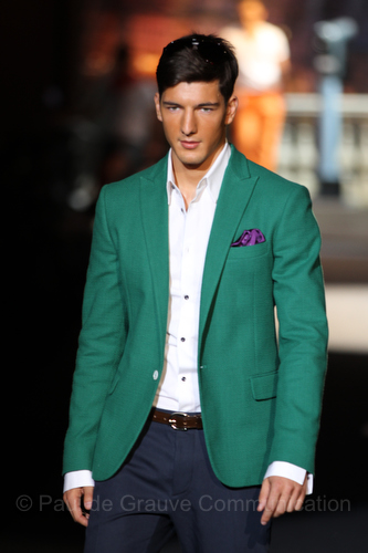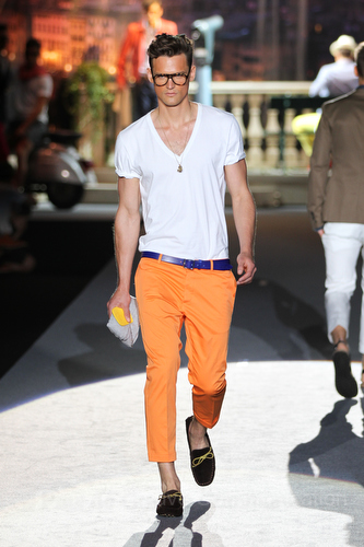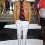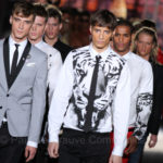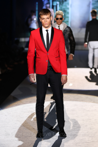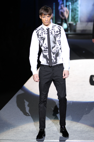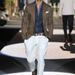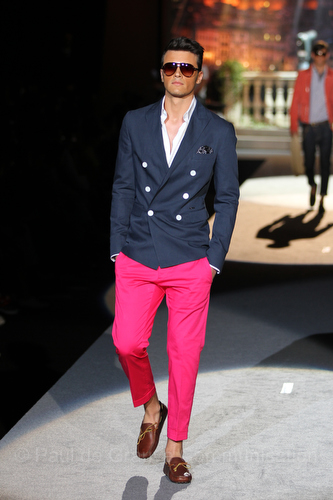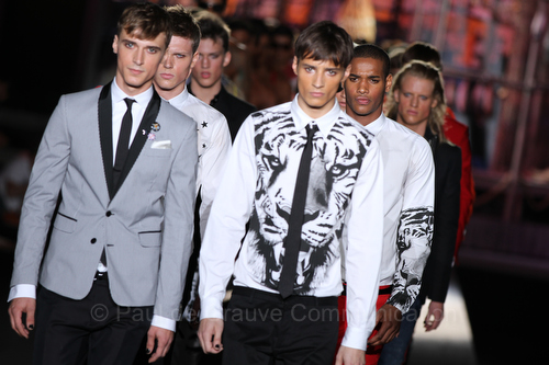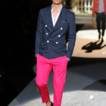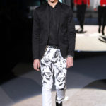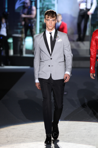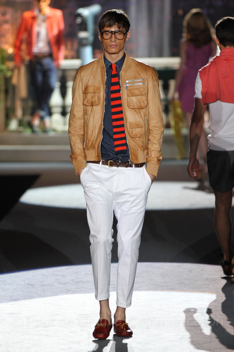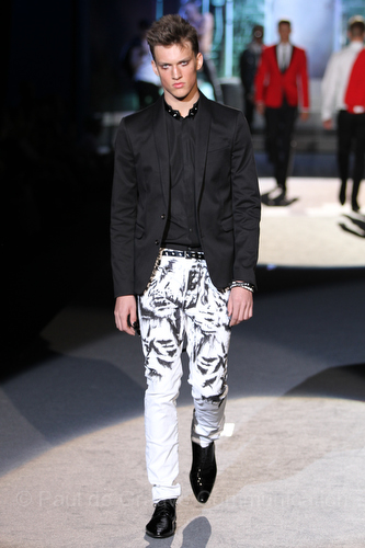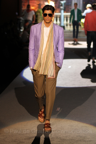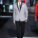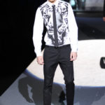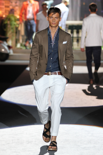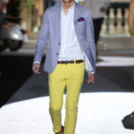 Il lino si alterna alla seta colorata: giallo e azzurro; grigio, bianco e pesca; lilla e marrone; verde e blu. La palette cromatica è varia, gli accostamenti cromatici sono pensati per vestire un uomo brioso e pieno di vita. L’ultima tappa è nella Londra più glam, dove sfilano outfit d’ispirazione rock. Silhouette skinny, borchie, pelle, vernice e un tocco di animalier.