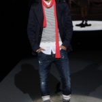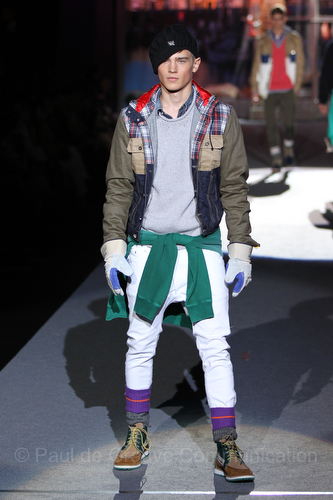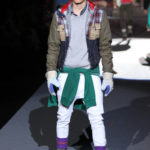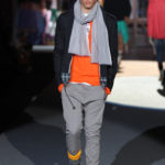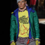 La Scandinavia è lo sfondo del look sportivo, ricercato nell’accostamento di colori e materiali, come nel caso del giaccone sportivo di pelle verde con un interno in tessuto tecnico blu, sotto, la camicia a, scacchi abbinata a maglia gialla e jeans attillati con calze in lana alte sugli scarponi. A completare l’outfit, berretta e guanti da giardiniere. Strati che si sommano sul corpo, per creare uno stile “casuale”, glamour.