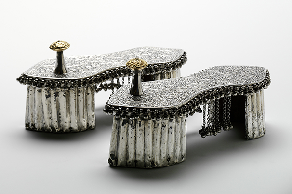 Tra i pezzi storici esposti, vi sono una corona d’oro portoghese con volute rococò, decorata con diamanti, rubini e smeraldi, una preziosa stola ecclesiastica veneziana del Seicento, una carrozza d’oro indiana, una tabacchiera d’oro del Settecento onusta di gioielli, appartenuta al re di Prussia Federico il Grande. Ancora più notevoli gli oggetti contemporanei, ben esemplificati dal cappello “Il Vello d’oro” dell’italiano Giovanni Corvaja, il quale per anni ha perfezionato una tecnica che permette di filare l’oro in sottilissime fibre: per realizzare l’articolo in mostra gli sono servite ben 2500 ore di lavoro e 160 chilometri di filo d’oro. Altrettanto unica e laboriosa appare la creazione del coreano Chung Hae-Cho: cinque ciotole di lacca fabbricate sovrapponendo pazientemente strato dopo strato di purissima lacca senza un sostegno o una struttura interna. Non sono meno impressionanti altri pezzi recenti, come lo spinotto per cellulari in oro di Aram Mooradian, dalla serie “A Comprehensive Atlas of Gold Fictions”, la sella Talaris di Hermès, la cui parte esterna in pelle è cucita a mano e presenta una struttura interna in titanio e fibra di carbonio, studiata per una distribuzione ottimale del peso del cavallerizzo; mentre il lampadario di Studio Drift racchiude in bolle di vetro dei fragilissimi soffioni di estremo realismo, e il meccanismo dell’orologio Vacheron Constantin è un capolavoro tecnologico che tuttavia viene prodotto a mano da uno specialista della precisione, a cui ogni pezzo costa anni di lavoro.