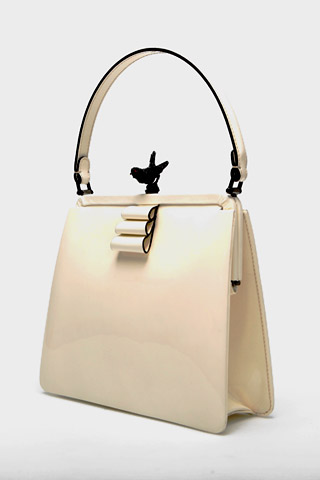 Gioca con il particolare della chiusura anche Valentino che rovista nel baule della nonna e tira fuori la Bird bag anni ’50 sulla quale s’è poggiato un uccellino che apre e chiude la borsetta. Divertente. Lo stesso motivo è presente sulla clutch da sera, in seta, color cipria, con applicazioni di piume.