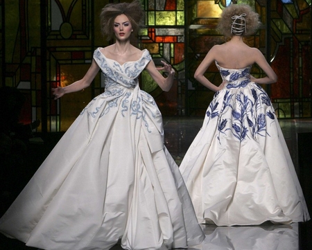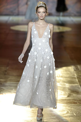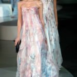 Più pacati e dolci i polvere, i blu acciaio, i blu ceruleo, i carta da zucchero atti a interpretare gli abiti svasati in shantung, le maglie in garza di cachemire, i piccoli tailleur in tessuto cangiante, le bluse oversize cinturate o meno, i madras ton sur ton degli abiti a grembiule.