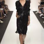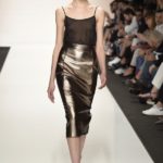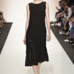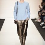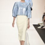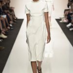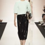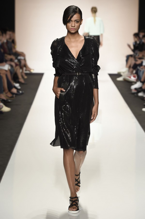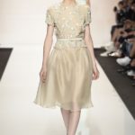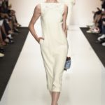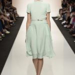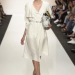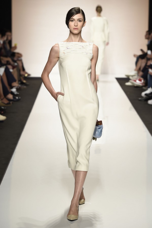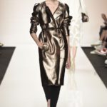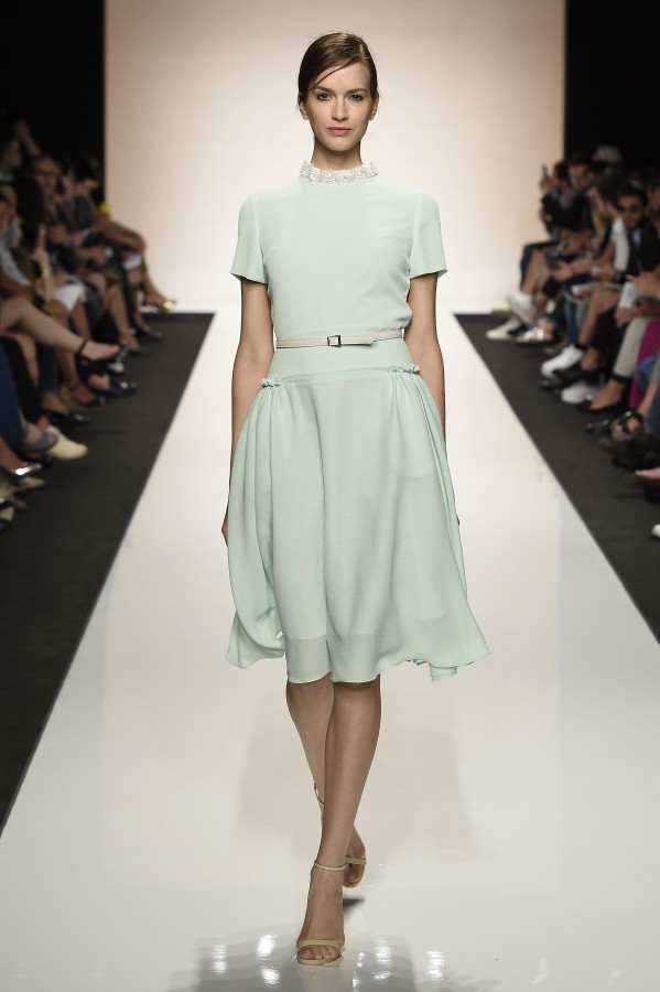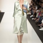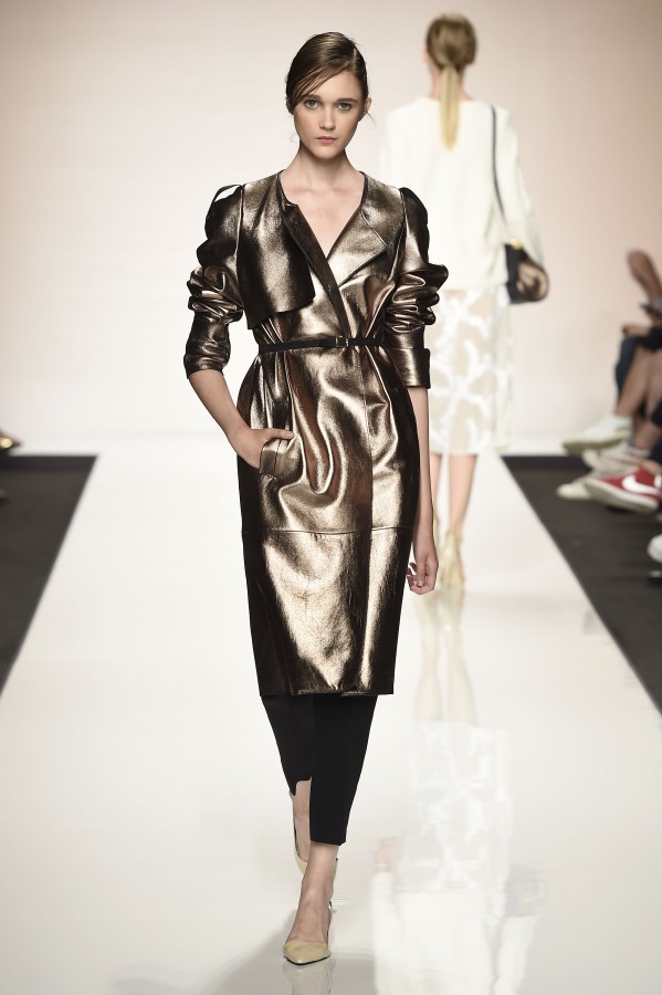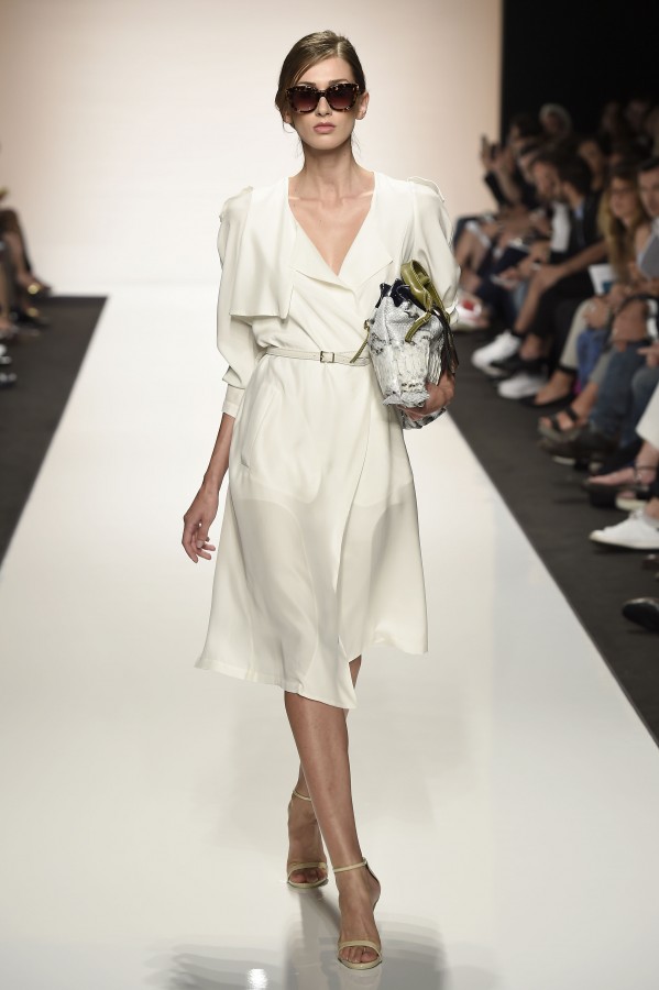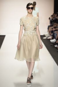 Capo must della collezione è l’abito trench, il capospalla entrato nella storia dell’abbigliamento oramai come evergreen, trasformato in abito, fluido e leggero come uno chemisier, declinato in seta twill o charmeuse, oppure utilizzato sui leggins in bronzo metallizzat,o o nero sfavillante per la sera: punto vita sempre segnato da una sottile cintura. La cintura in vita ritorna anche negli abitini dal sapore retrò con il punto vita basso, a segnare il passaggio dal corpino alla gonna. Di gusto retrò anche la lunghezza della gonna, ampiamente sotto il ginocchio tanto negli abiti, petit robe blanche, dalla geometria squadrata -che si ritrova anche in outfit voluminosi, gonna e giacchino celeste-, come in quelli dalla gonna leggera e mossa.