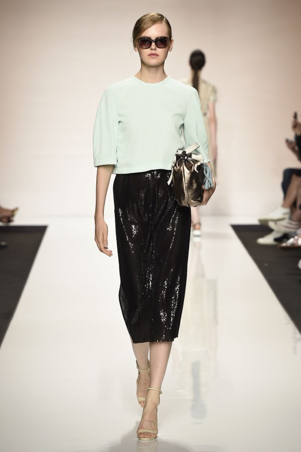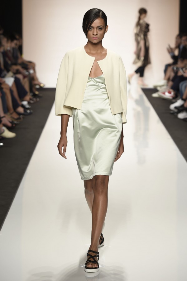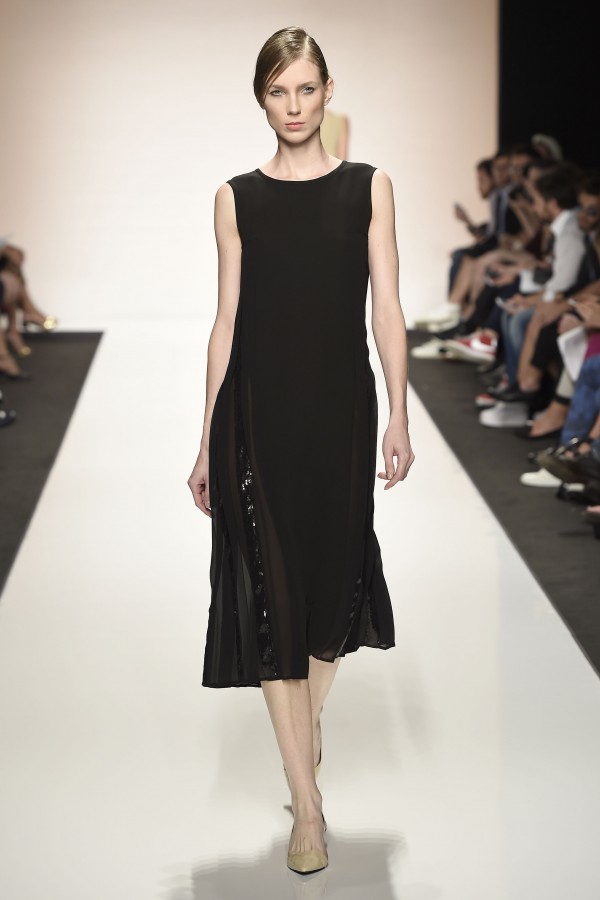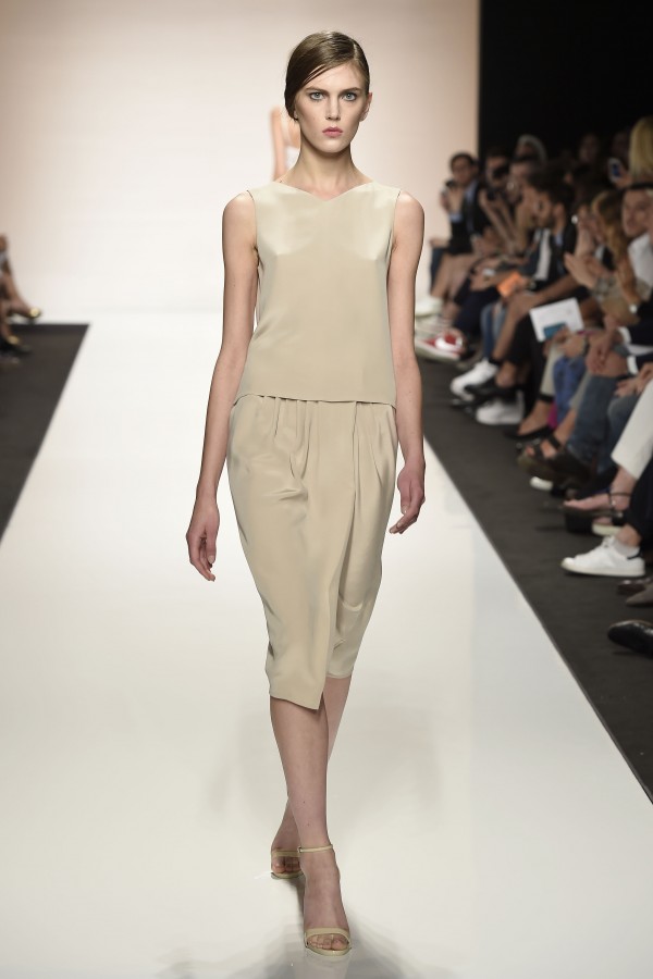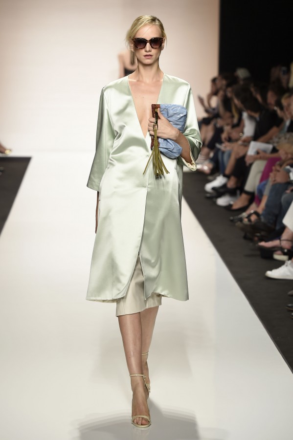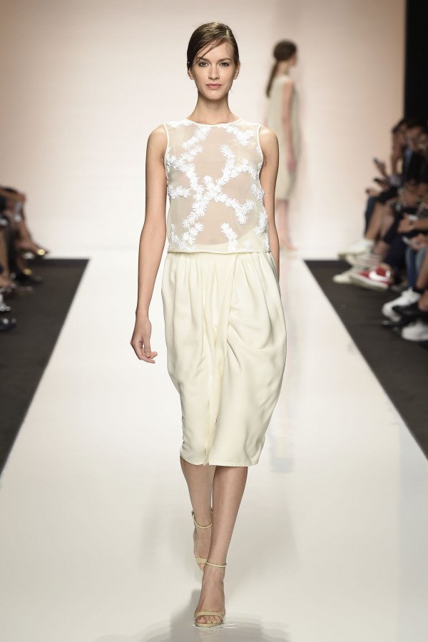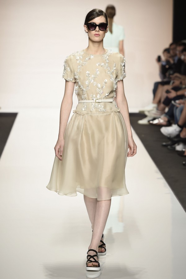 La semplicità della linea delle bluse e di alcuni abiti è impreziosita da ricami floreali ton sur ton. I materiali sono molto vari, le sete charmeuse etwill, le organze trasparenti, le viscose, i materiali lucidi per la gonna e il giacchino corto celeste acqua, e poi la lana. La paletta dei colori è dominata dai neutri, avorio, albume e nocciola, perla iridescente, vira poi sui verde e azzurro acqua, menta e ristagna su bronzo e nero metallizzati. Sandali bassi intrecciati anche sugli abiti più eleganti e comunque sempre sandali o un decolté neutro molto elegante.