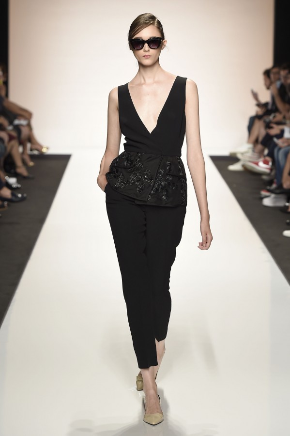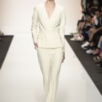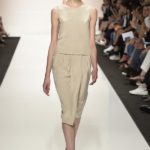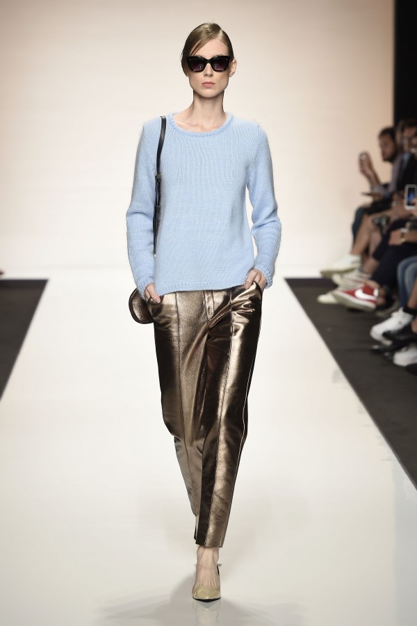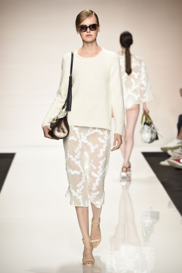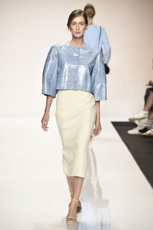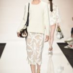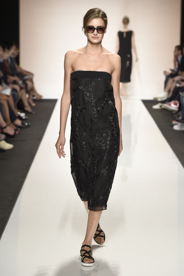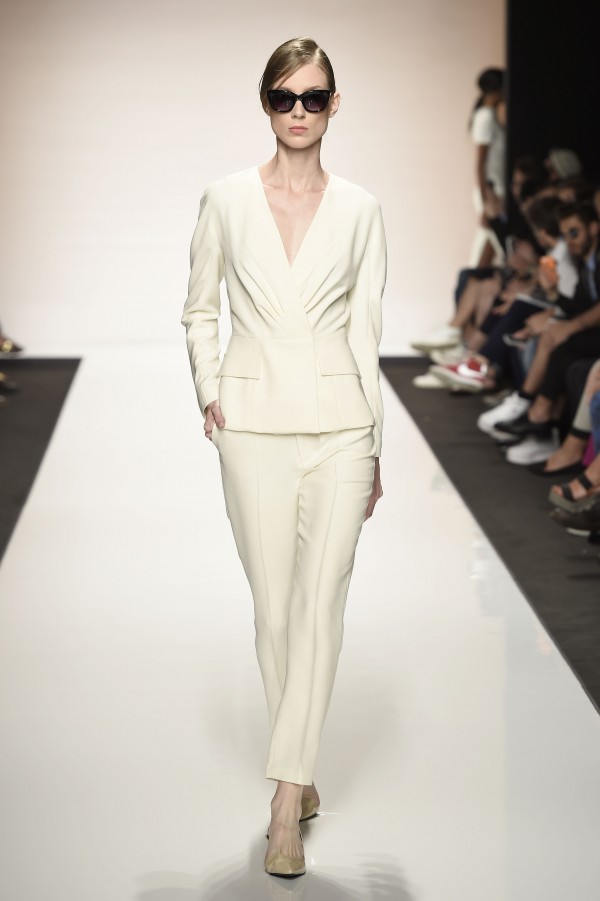 La semplicità della linea delle bluse e di alcuni abiti è impreziosita da ricami floreali ton sur ton. I materiali sono molto vari, le sete charmeuse etwill, le organze trasparenti, le viscose, i materiali lucidi per la gonna e il giacchino corto celeste acqua, e poi la lana. La paletta dei colori è dominata dai neutri, avorio, albume e nocciola, perla iridescente, vira poi sui verde e azzurro acqua, menta e ristagna su bronzo e nero metallizzati. Sandali bassi intrecciati anche sugli abiti più eleganti e comunque sempre sandali o un decolté neutro molto elegante.