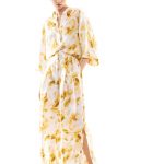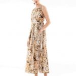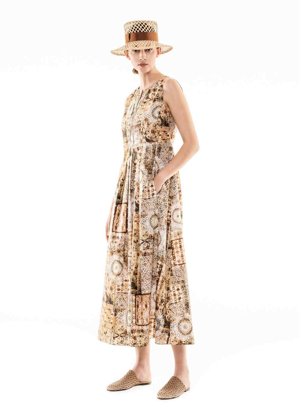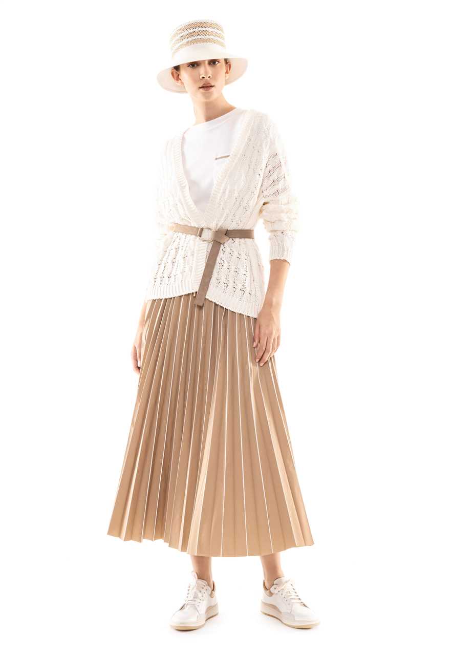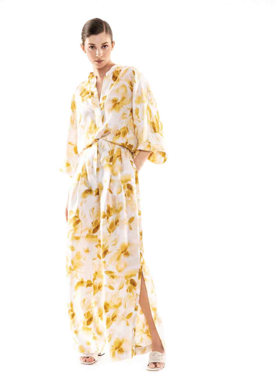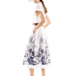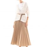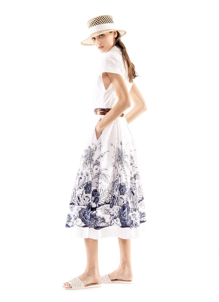 Ma ecco che altri capi ci portano verso figure femminili più giovani, con una eleganza più easy, che amano portare una camicia di seta stampata in tenui toni del giallo come fossero pennellate di colore; o bianca di popelin con una gonna con ramage di fiori in blu o in marrone con una cintura che segna il punto vita; un moderno chemisier con una intricata stampa di fiori e figure geometriche nel blu delle antiche ceramiche o nel neutro beige. Giovanile e ispirata alle immagini dell’età del jazz del “Grande Gatsby” la gonna plissé alla caviglia a pieghe soleil arricchite da ritocchi a contrasto dipinti a mano. Una donna che vorrà arricchire il suo guardaroba con l’abitino sangallo dal disegno sofisticato ed anche qualche capo di maglieria, cardigan o abito lungo dall’intensa tonalità caffè, le mules intrecciate o moderne scarpe da tennis.