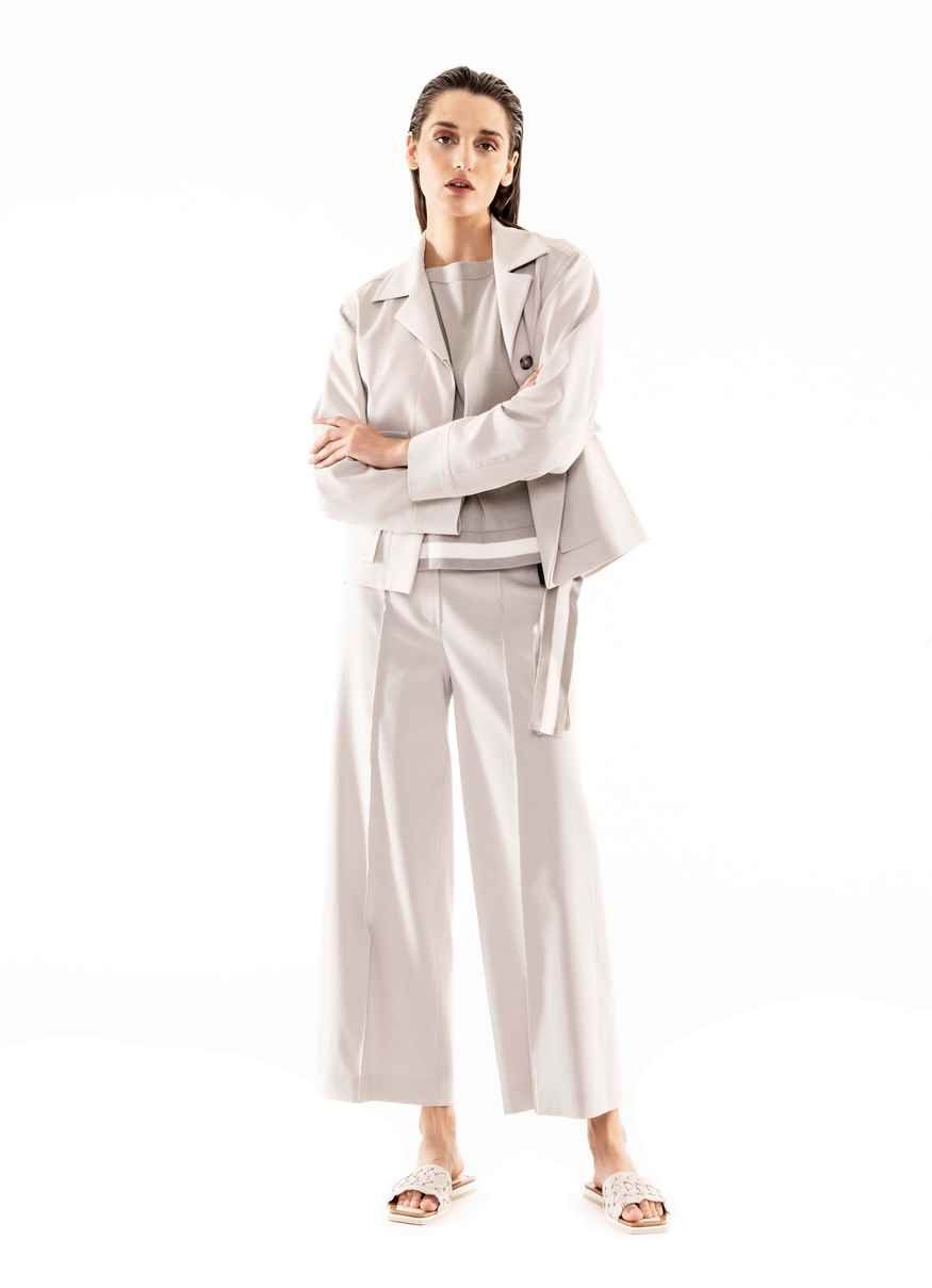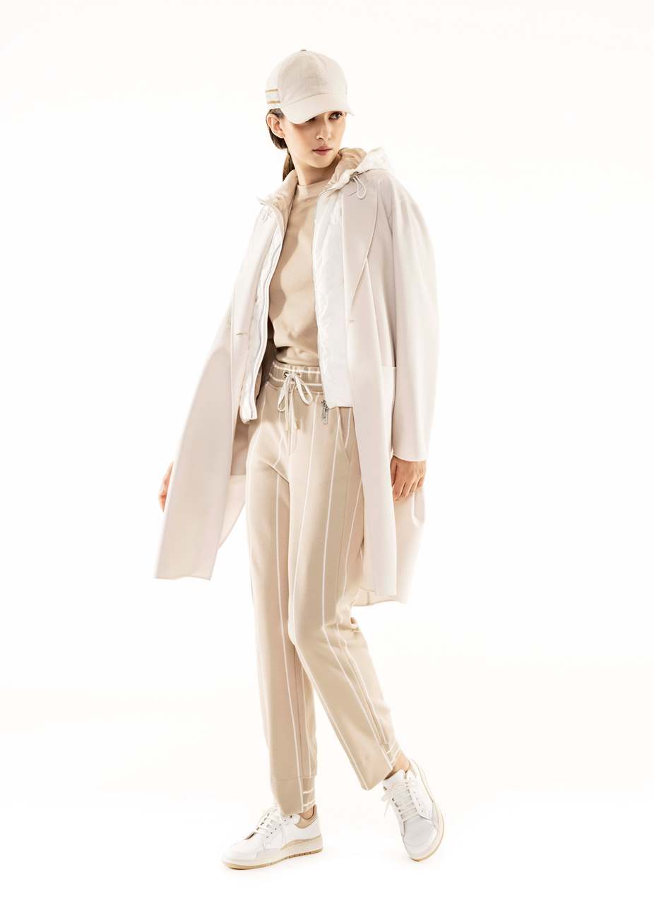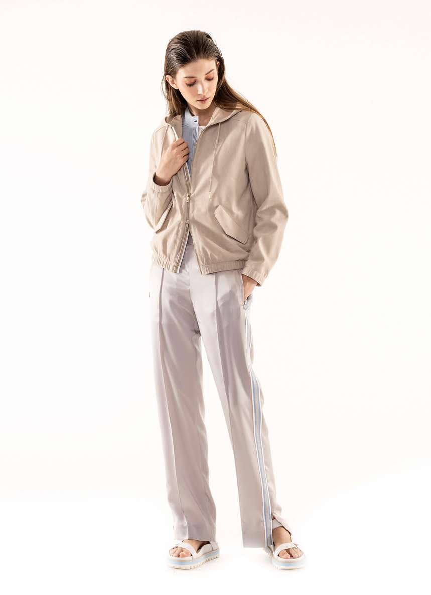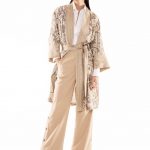 Quella con una personalità molto definita che si fa notare per lo stile sobrio, che preferisce i toni neutri, chic anche nei momenti informali, per questo sceglie un brand che si distingue perché veste la quotidianità; non disdegna un tocco di modernità per il tempo libero e si concede felpe e pantaloni con le bande laterali non banali, che diventano delle strisce luminose o preferisce un morbido pantalone bianco a righe beige portato con giovanile bomber sempre sui toni del beige. Adatto a lei, al suo stile chic, lo spolverino chimono stampato con frange e quello reso prezioso dalla tessitura jacquard con vari filati. La maglieria richiama l’attenzione per la sua vestibilità tanto nei cardigan come negli abiti lunghi.