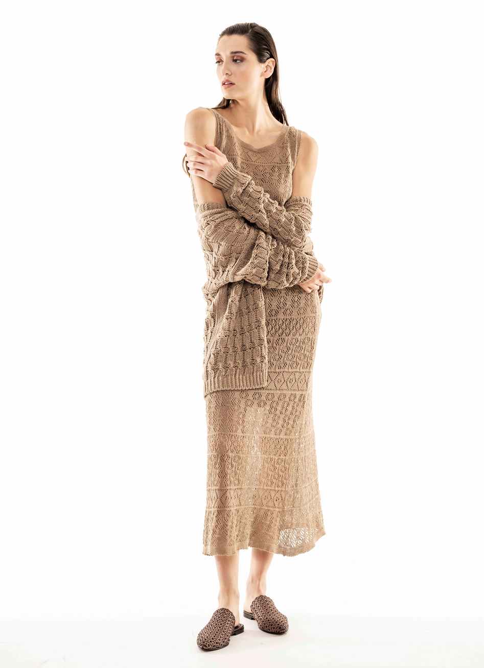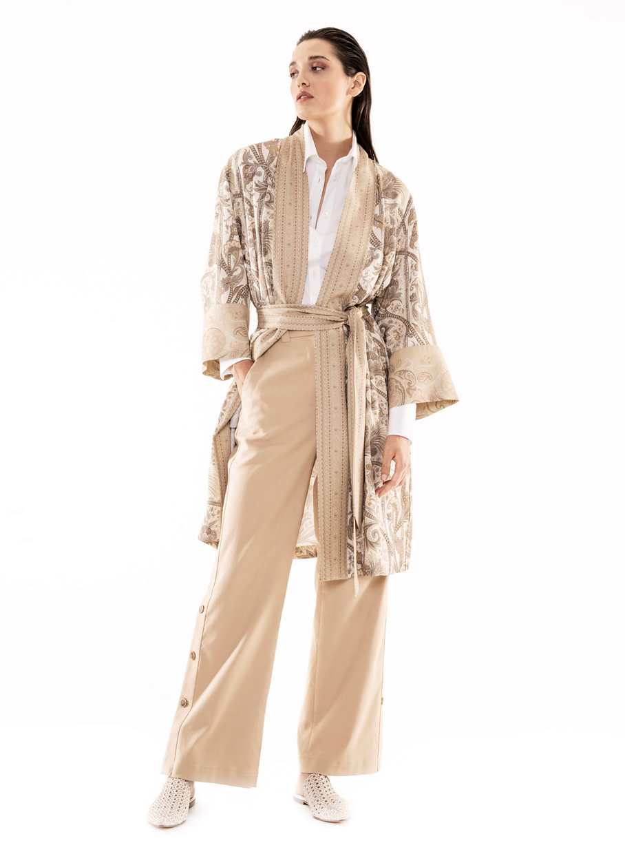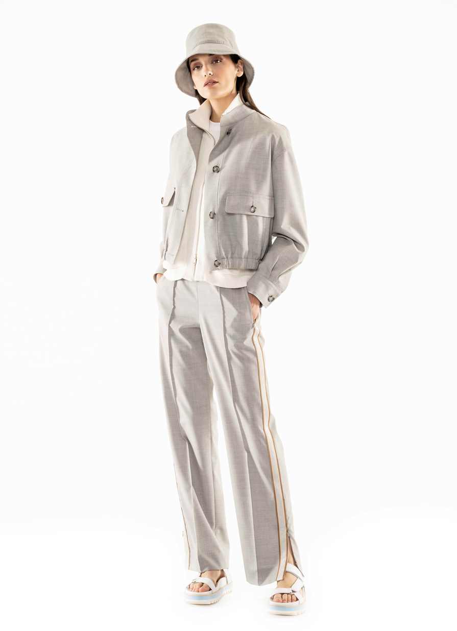 Quella con una personalità molto definita che si fa notare per lo stile sobrio, che preferisce i toni neutri, chic anche nei momenti informali, per questo sceglie un brand che si distingue perché veste la quotidianità; non disdegna un tocco di modernità per il tempo libero e si concede felpe e pantaloni con le bande laterali non banali, che diventano delle strisce luminose o preferisce un morbido pantalone bianco a righe beige portato con giovanile bomber sempre sui toni del beige. Adatto a lei, al suo stile chic, lo spolverino chimono stampato con frange e quello reso prezioso dalla tessitura jacquard con vari filati. La maglieria richiama l’attenzione per la sua vestibilità tanto nei cardigan come negli abiti lunghi.