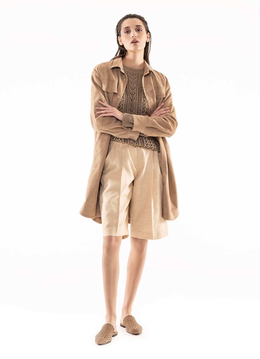 Di cosa hanno veramente bisogno le donne, si chiede Marco Baldassari, direttore creativo di Eleventy. È una ottima domanda che qualsiasi creativo dovrebbe porsi prima di affrontare le fatiche di mettere a punto una nuova collezione. Dimostra certamente un atteggiamento empatico, di volersi immedesimare con i desideri e le necessità della donna di oggi che vuole buttarsi alle spalle i problemi del lungo isolamento della pandemia ma non vuole tralasciare ciò che ha imparato. Si tratta inoltre di un atteggiamento estremamente pratico: solo intercettando ciò che è utile alle clienti, oltre che “bello e ben fatto”, la collezione avrà pieno successo.