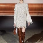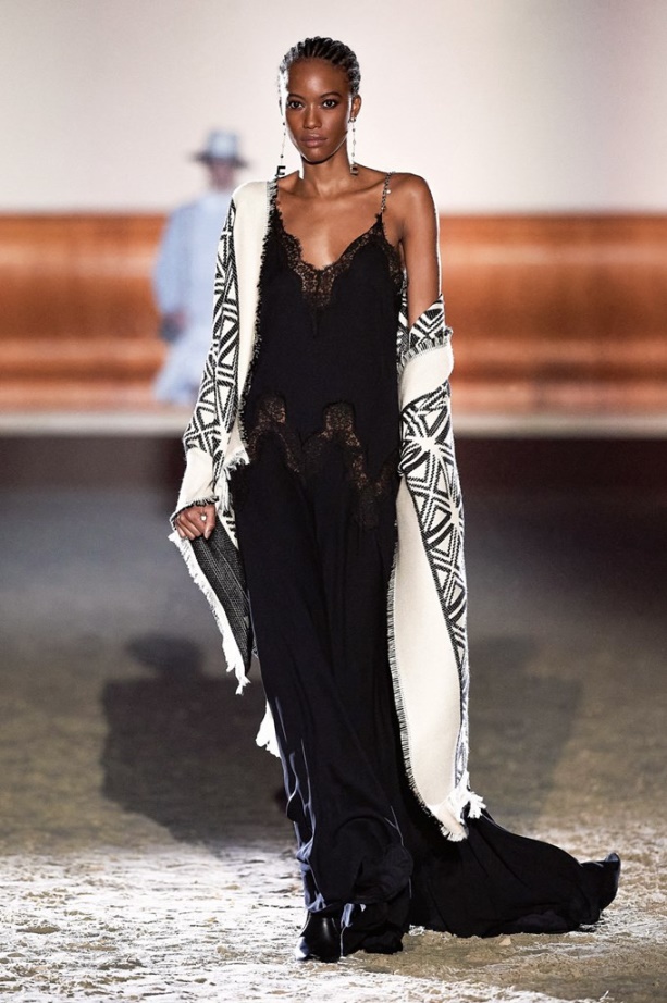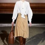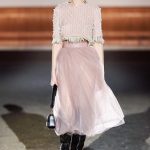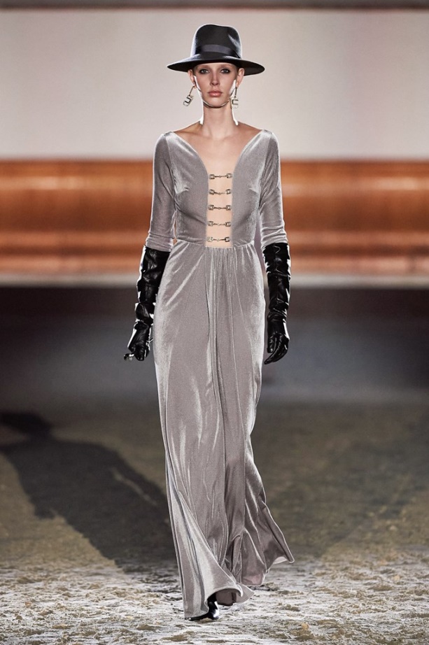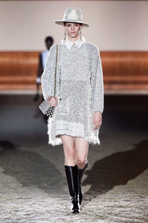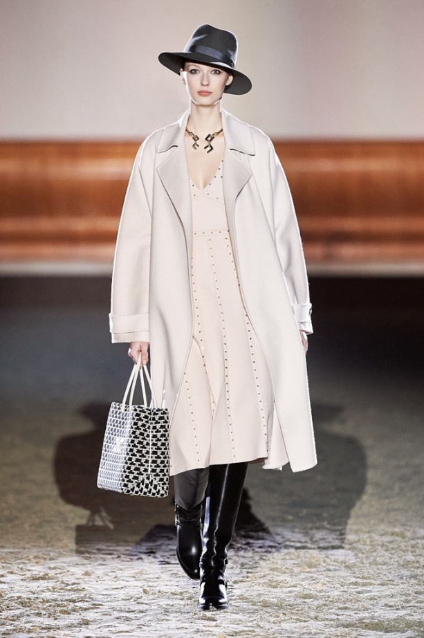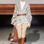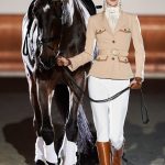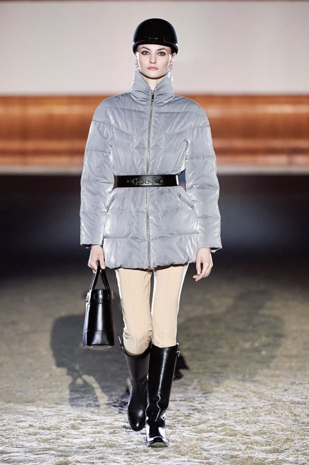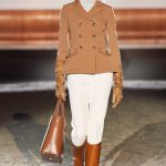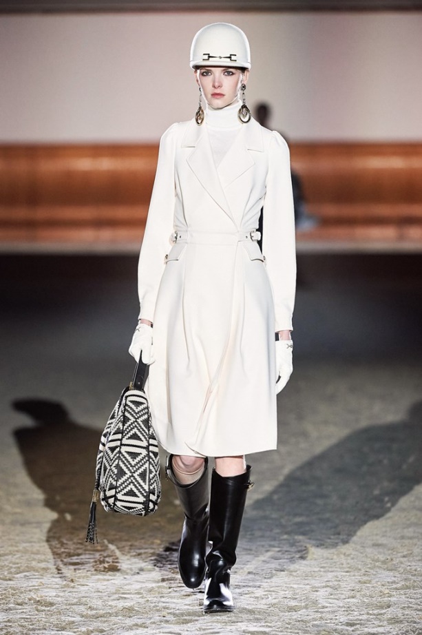Cappotti, piumini, maglieria in tweed, pantaloni e stivali da cavallerizza, bluse ancien régime; mantelle dalle forme geometriche, cardigan morbidi, giacche sagomate e accessori, cappelli da fantino ed anche eleganti cappelli a tesa larga, guanti lunghi, stivali alti, che richiamano i caratteri e le linee della selleria, anfibi, questa in sintesi il contenuto dell’intera collezione.