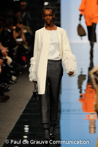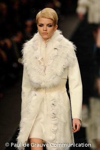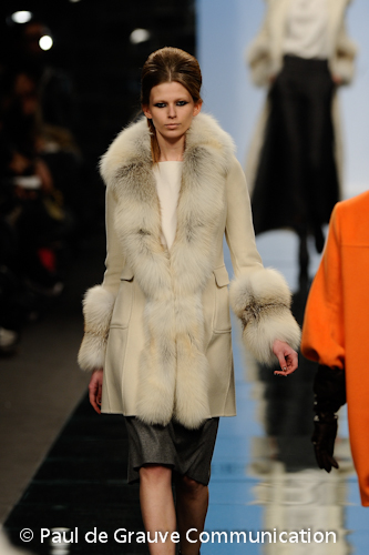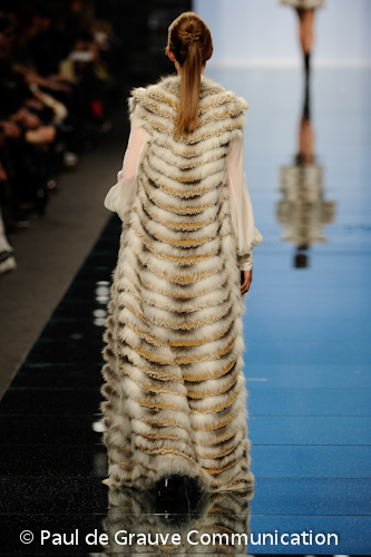 I lunghi cappotti, decostruiti ed essenziali, caratterizzano l’intera proposta insieme alle pregiate pellicce in visone, volpe e persiano.
