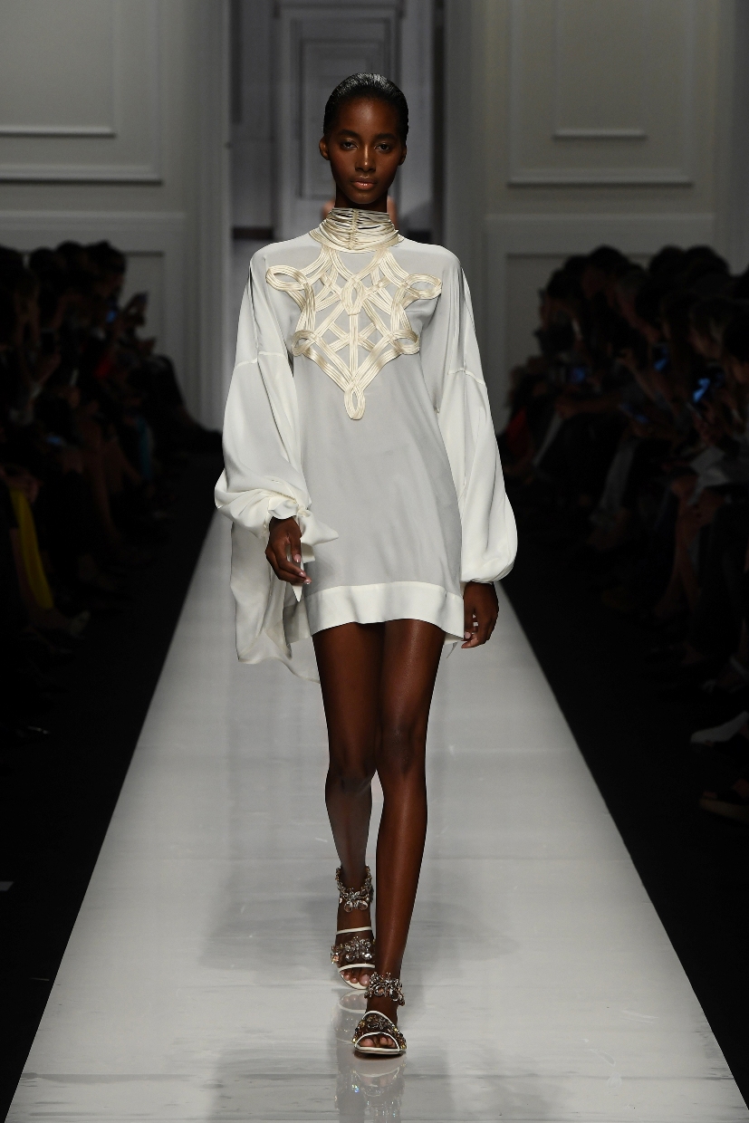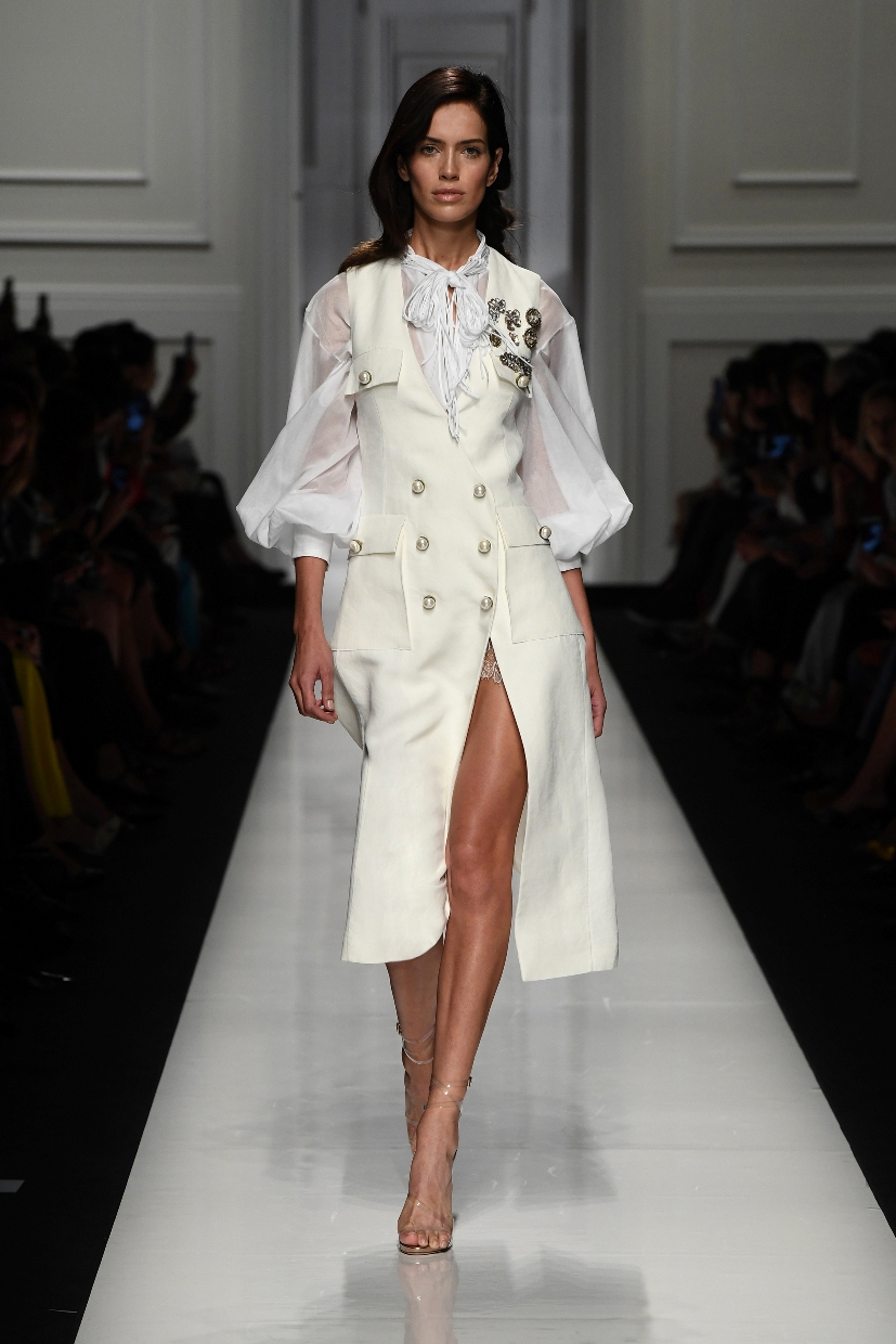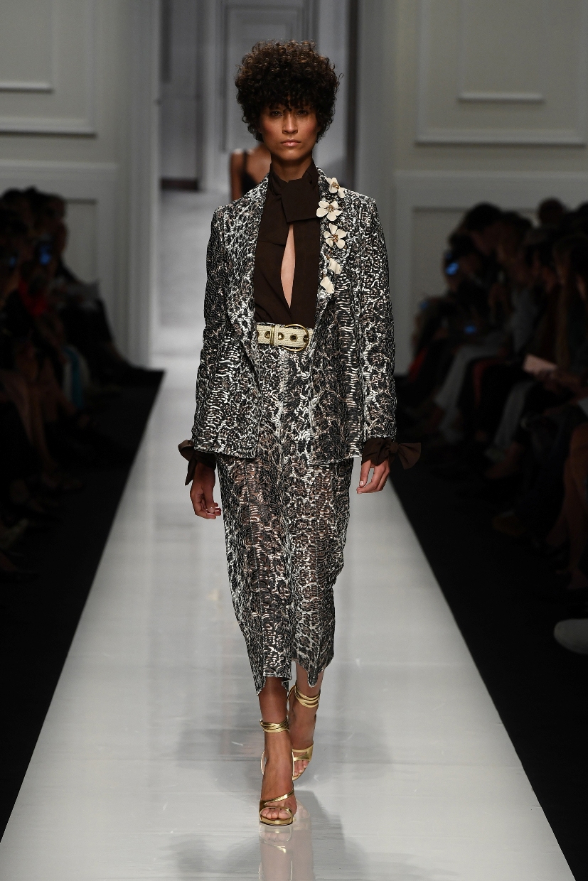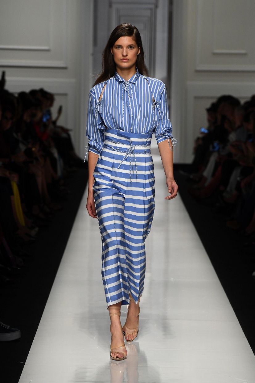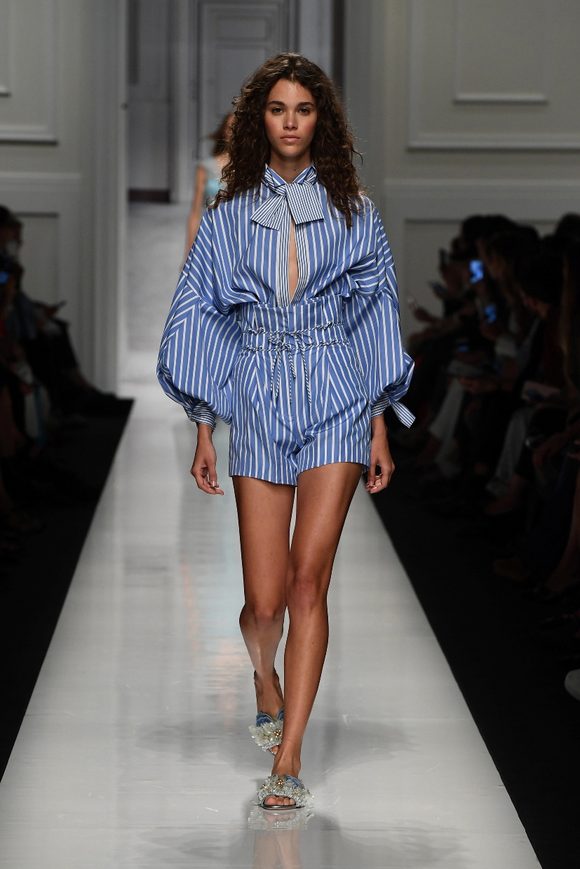 Una donna decisamente sensuale è quella che porta Ermanno Scervino in passerella per la P/E 2017. Non solo negli abiti da sera dove prevalgono le trasparenze dei pizzi, e delle organze di seta, ma anche nei capi in eco-pelle che aderiscono strettamente al corpo, in quelli più quotidiani come i completi a righe nella loro abbondanza quasi rinascimentale, e in quelli dove la profonda scollatura e gli spacchi laterali sulle gambe conferiscono all’indossatrice una sensualità accentuata ma, bisogna ammetterlo, non aggressiva e tanto meno sfrontata o trasgressiva.