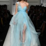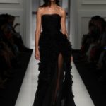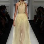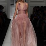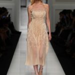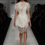 La lavorazione del tessuto ha il suo punto culminante nell’organza plissettato a nido d’ape negli abiti da sera nei quale sottolinea il punto vita o serve a dare volume al tessuto nella gonna. Talvolta sono le applicazioni a dare volume al tessuto come nell’abito longhette dalle tonalità rosa e bianche con una sottile cintura di cristalli o nel nero lungo. Bellissimi i pizzi che creano disarmoniche trasparenze; ma notevole la lavorazione del tessuto dei due abiti a grandi foglie verde e rosa intenso, drappeggiati in vita e impreziositi da cristalli in tinta a trattenere il drappeggio e ad adornare la scollatura.