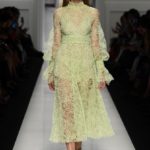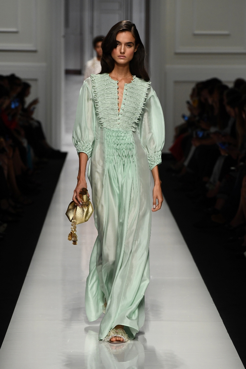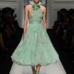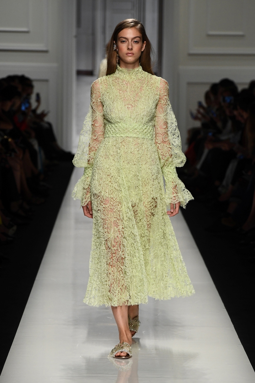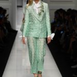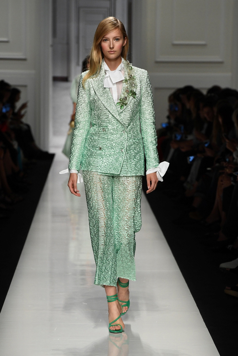 I colori sono prevalentemente pastello, verde, giallo che talvolta assume tonalità dorate, celeste così tenui da rendere ancora più eterei gli abiti da sera in pizzi e organze, ma presenti anche in tessuti apparentemente più corposi come nel tailleur pantalone verde, giacca doppio petto con versore impreziosito da un ramage di cristalli sempre di un verde “lattuga tenera”. Non manca il bianco nei pizzi e nelle giacche militari; da notare quello utilizzato nelle due belle redingotte con doppi bottoni di perle, grandi tasche e tante spille che ricordano vagamente le decorazioni militari. Prevalgono i rosa per i pizzi anche nella tonalità carne. Pochi gli stampati, quasi assente il nero. Da sottolineare l’effetto ottico raggiunto con il rigato regimental mescolato in righe orizzontali e verticali nei capi più vacanzieri.
