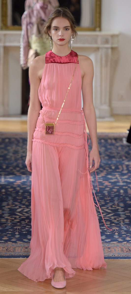 La maison nobilita al massimo la combo plissé-leggerezza, ma non solo. Sono abiti dall’anima antica e mood ultra-contemporaneo quelli immaginati da Pierpaolo Piccioli; vaporosi, fluidi, impalpabili e portabili. Uno charme sartoriale quello del plissé by Valentino che mette in risalto la silhouette senza segnarla in modo ossessivo. La accompagna, la avvolge piacevolmente senza mai comprimere le forme. E’ gentile, le sue pieghe strette e regolari si aprono come i petali di una rosa, rendono la figura libera.