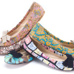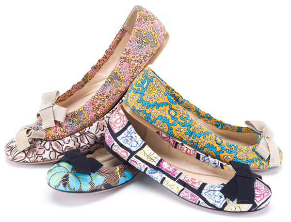 Eleganti ballerine fantasia con fiocco e nastri di gros grain completano un look giocoso e romantico. L’amore di Miuccia Prada per le stampe aveva già ispirato la linea di borse in foulard, composta da handbag, pochette e bauletti in tessuto o in saffiano, lanciata per la Primavera /Estate del 2010.