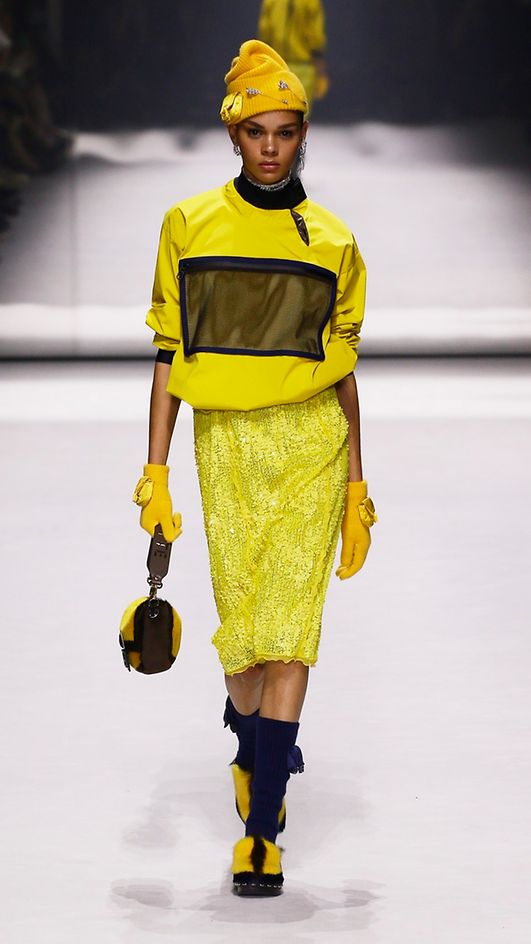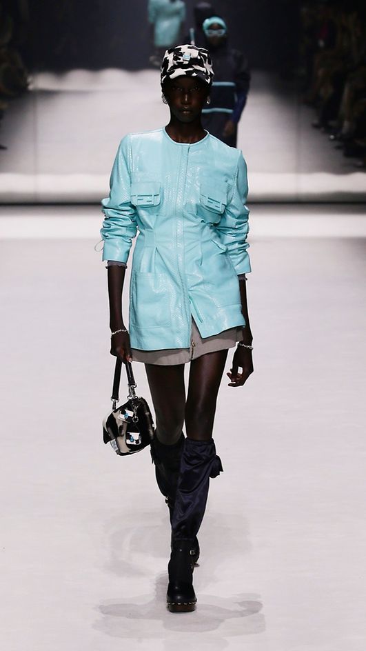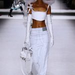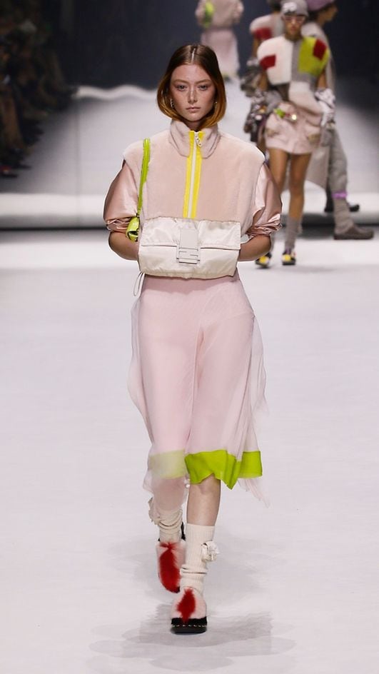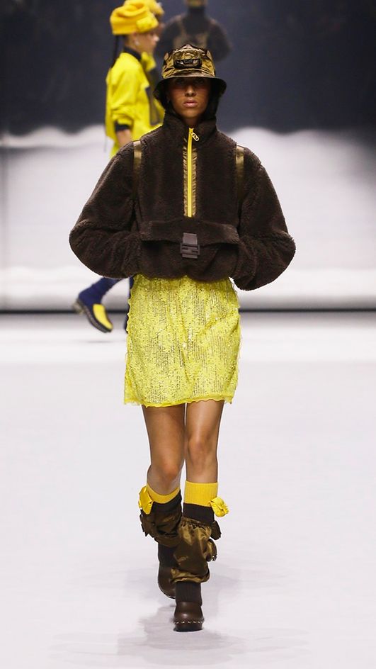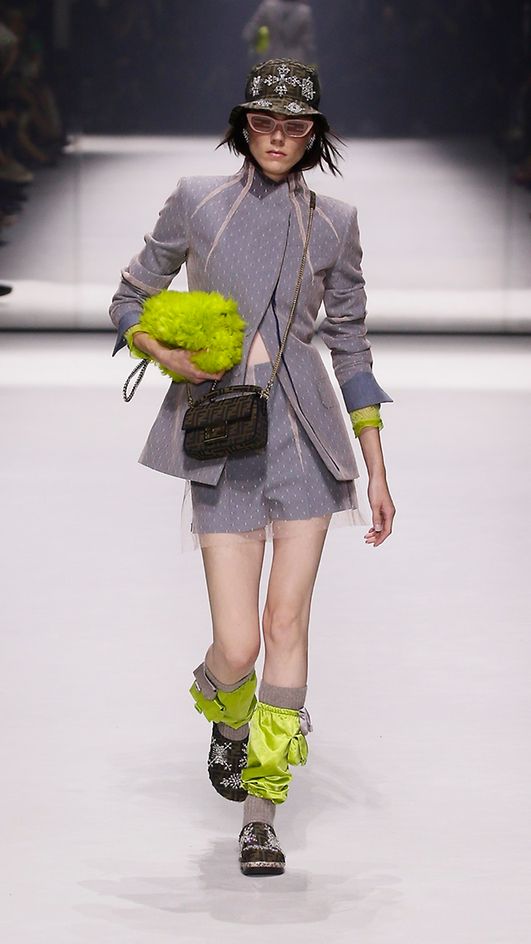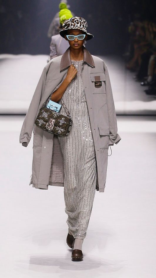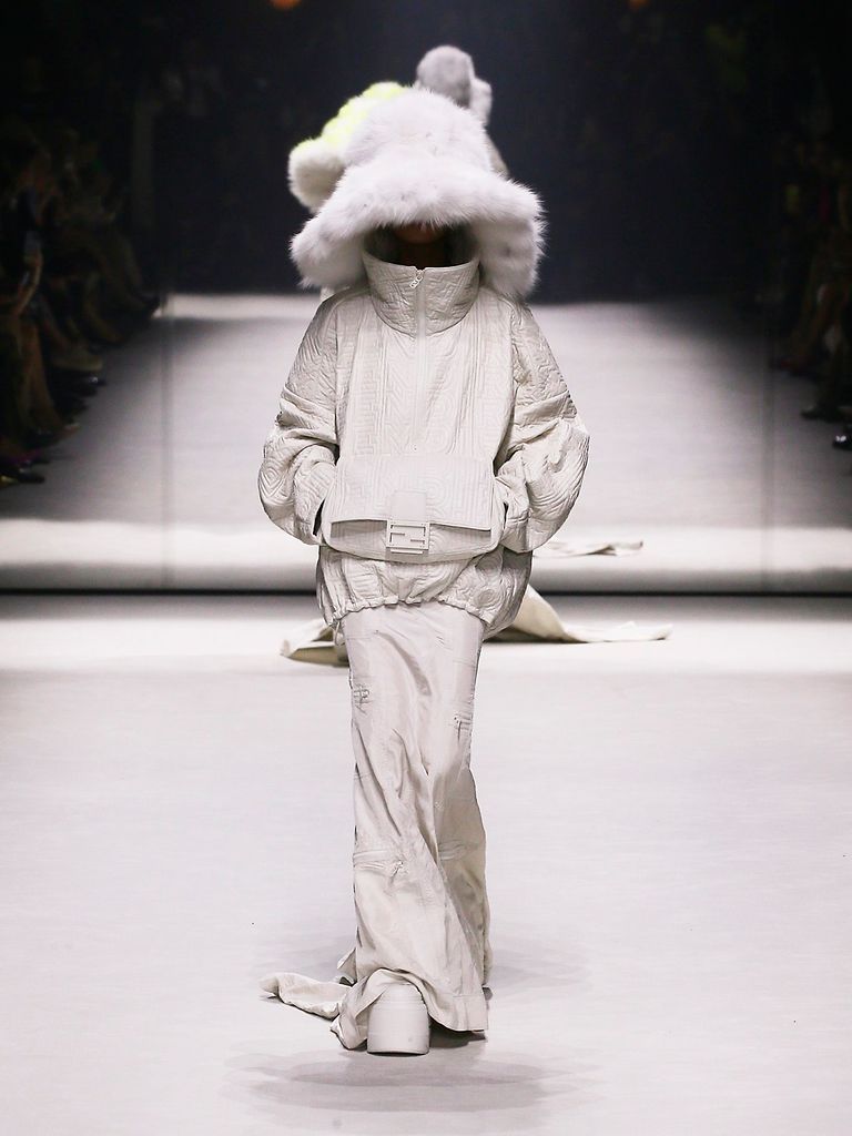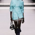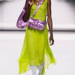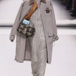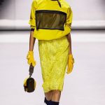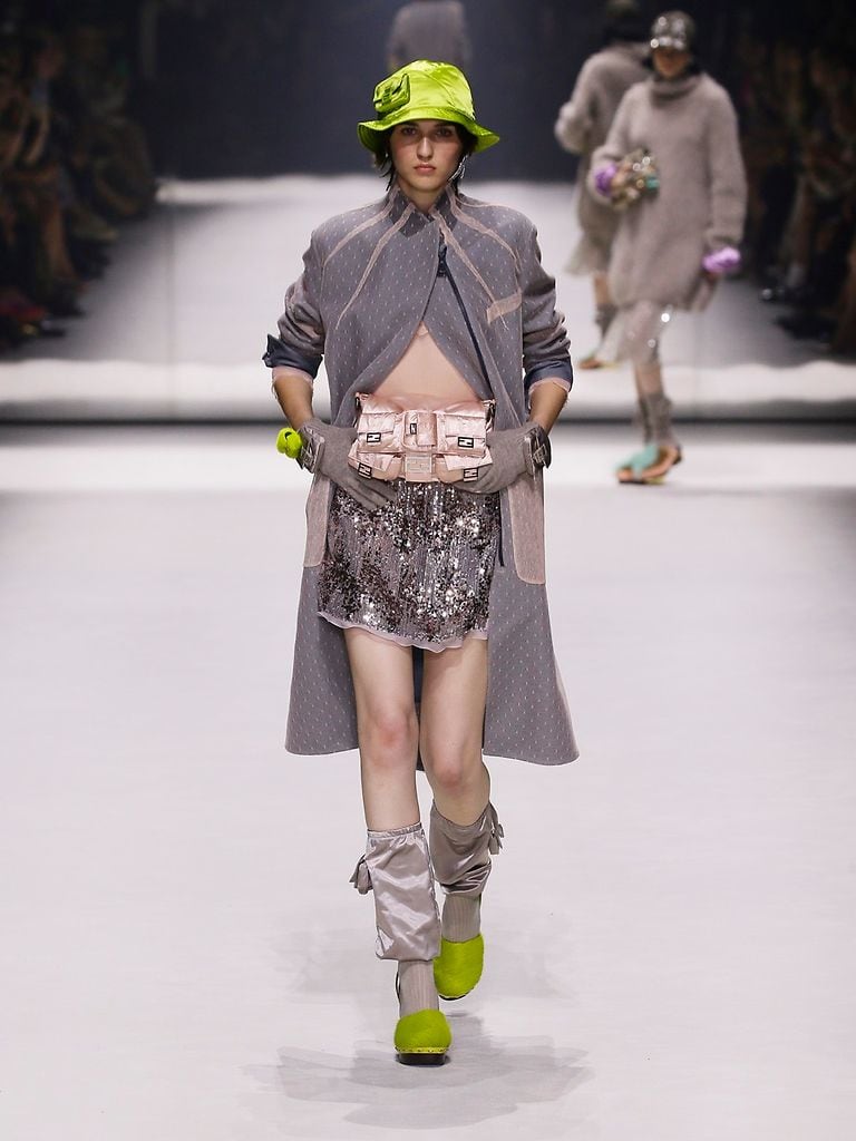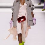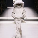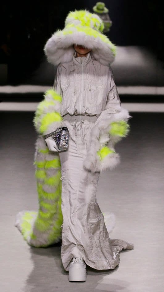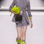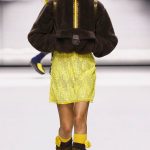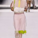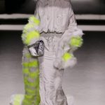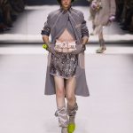 Tra musica tecno e scenografia leggermente fumosa ma priva di artifici, un enorme specchio ha accompagnato scaltro e fugace tutto lo show. Il grigio perla ha dominato la scena. Pur lasciandosi accompagnare da dirompenti violetti e verdi acidi, da brillanti turchesi come da soavi taupe e rosa cipria; la sua innata sensazione di avvolgente morbidezza ci ha conquistato. I codici ladylike di Fendi hanno sperimentato un alto livello di couture contemporanea come il tulle che si sovrappone a luccicanti paillettes ed elementi grunge e sportswear mischiati a leggere sovrastrutture in satin e raso. Le linee sono fluide anche sulle pellicce ed i cappottoni-accappatoio dall’aspetto velour. I maxi cappelli pelosissimi e le stole impellicciate a strascico che si accendono nelle nuance del bianco ghiaccio e giallo ottico sono stati quell’elemento upper class ironico ed eccedente, ma non irriverente, che ha ben evidenziato il lato più salace della Maison con la doppia F.