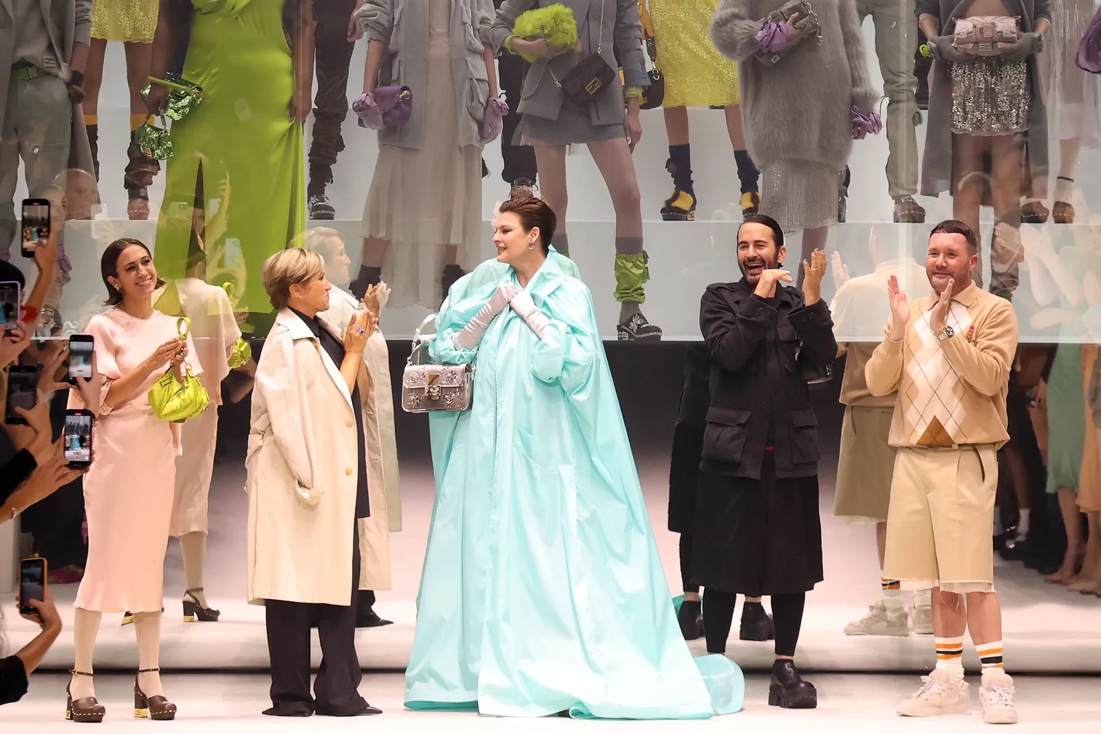 New York, Sfilata Fendi Resort 2023: Delfina Delletrez, Silvia Venturini Fendi, Linda Evangelista, Marc Jacobs e Kim Jones.