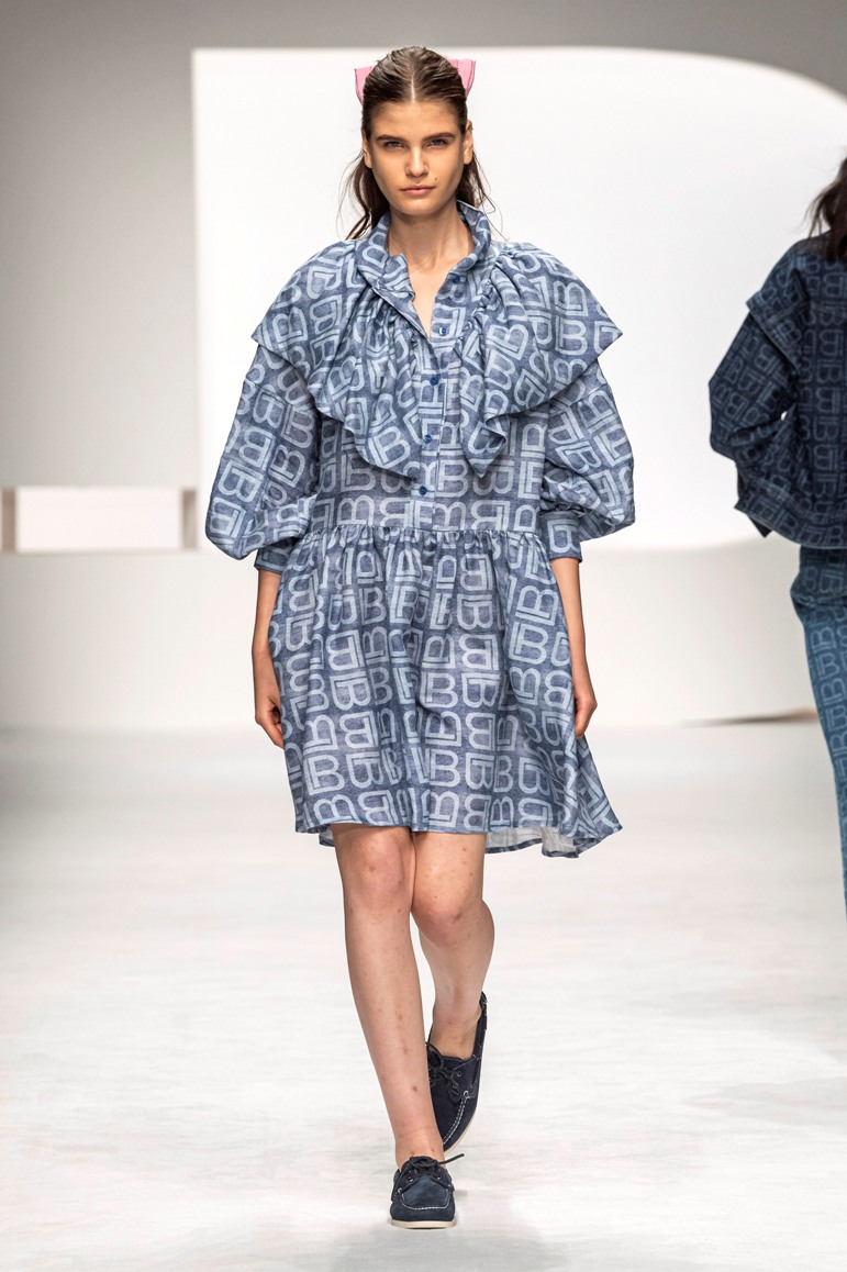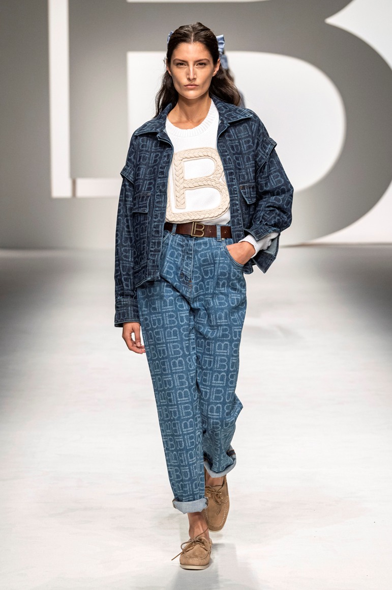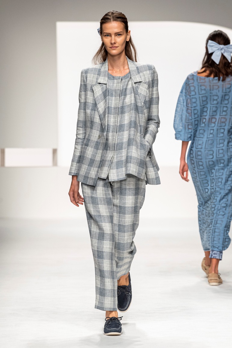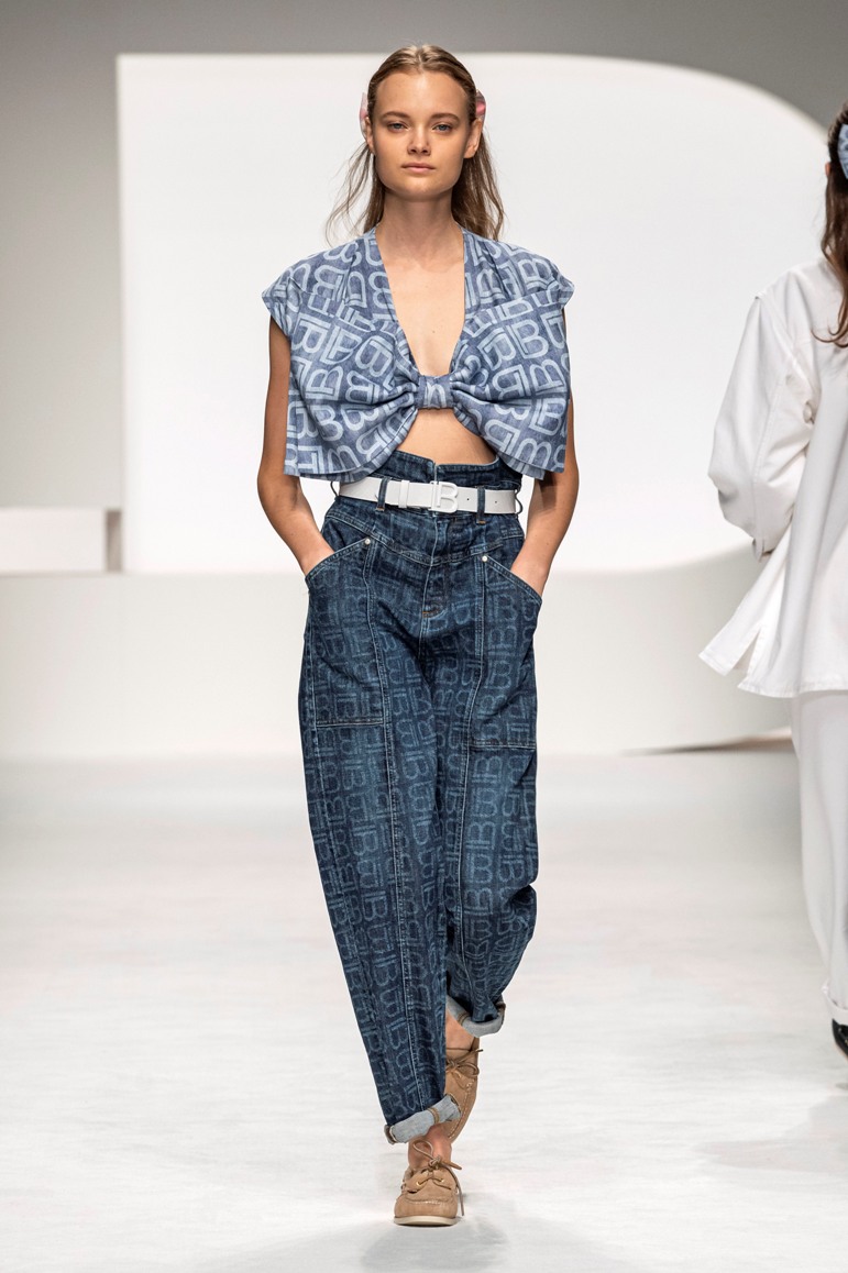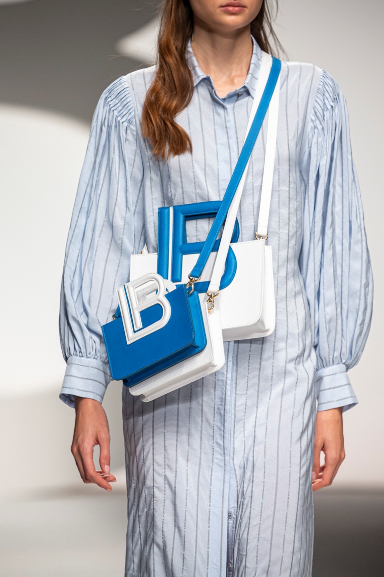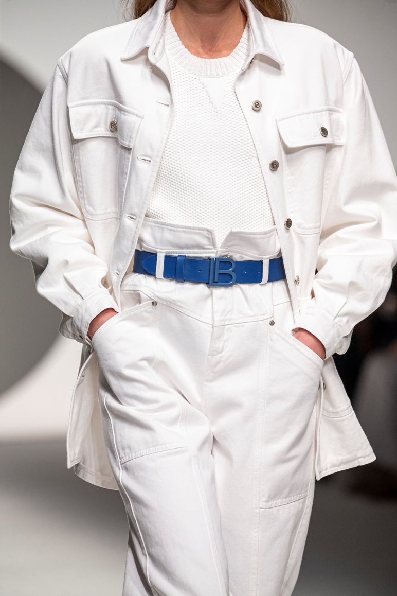 Il logo LB, stampato sulle tele anche denim e riprodotto sugli accessori (cinture e scarpe), fino a trasformarsi nel manico della borsa, è uno dei fili conduttori della collezione. I colori vanno dal bianco al giallo, al fuxia, all’arancio ma prevalgono le tonalità pastello anche sfumate che accentuano la leggerezza degli abiti. L’ultima uscita, un leggins e top iridescente indossato da Anna Cleveland trasporta al futuro dei tessuti luminosi e iridescenti.