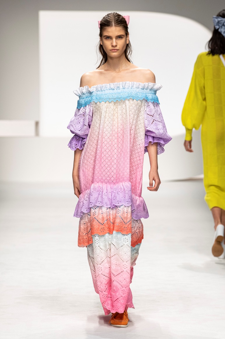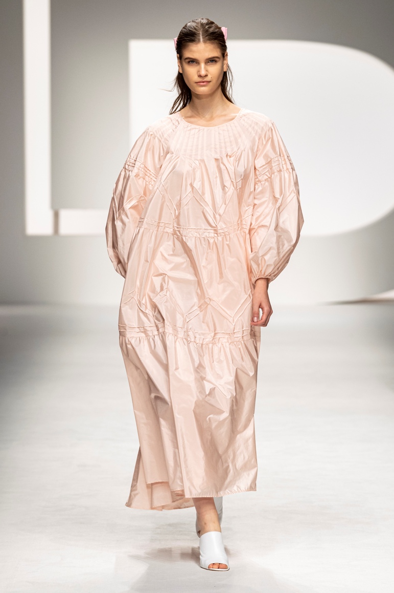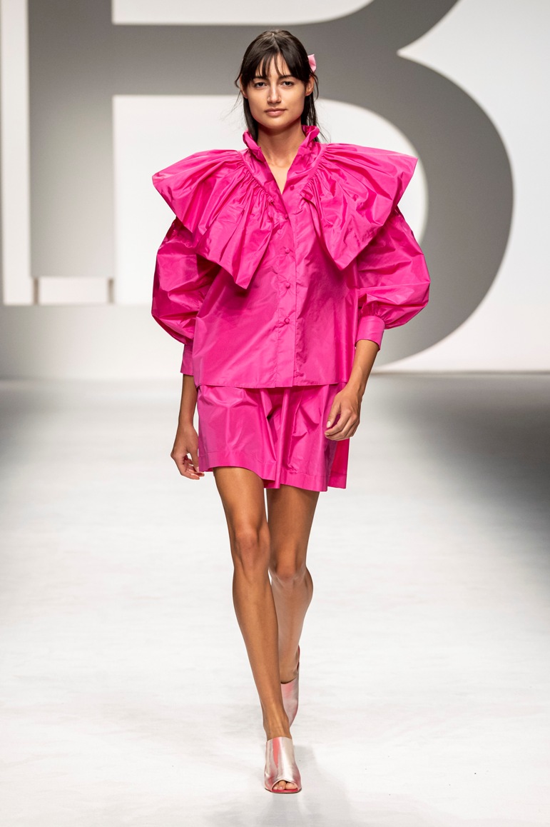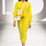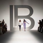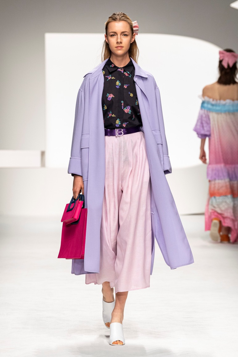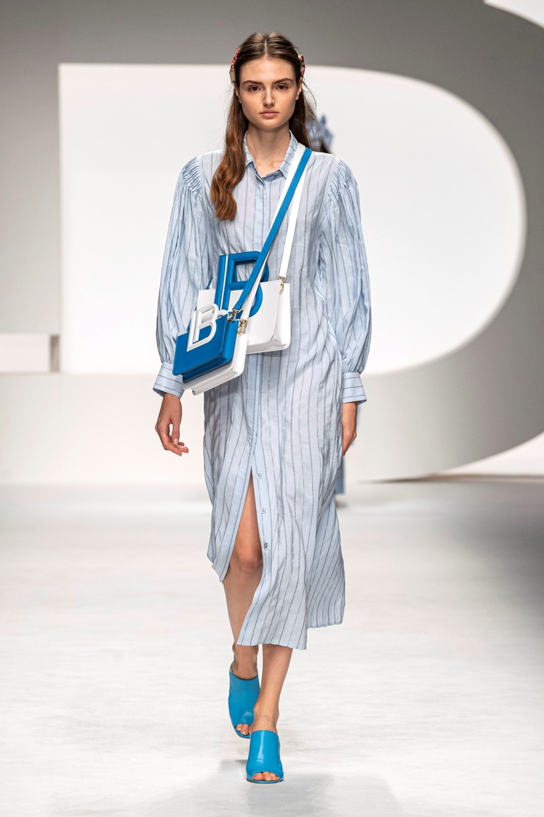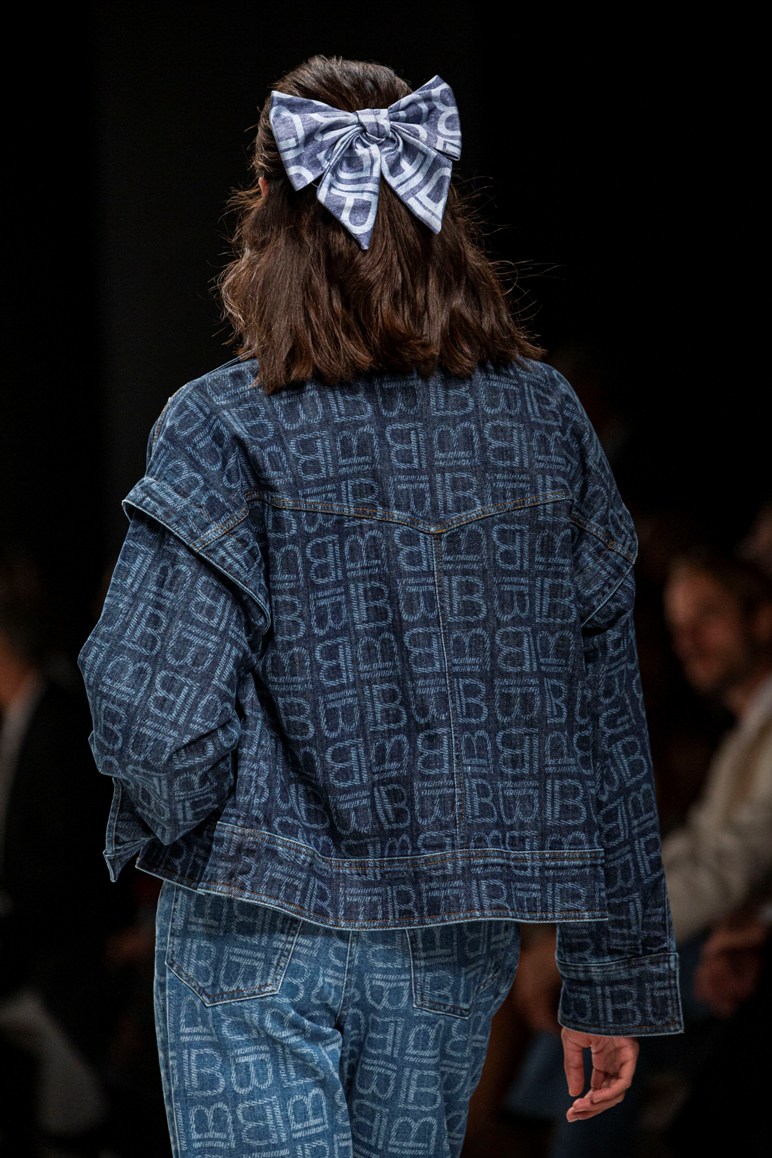 Il logo LB, stampato sulle tele anche denim e riprodotto sugli accessori (cinture e scarpe), fino a trasformarsi nel manico della borsa, è uno dei fili conduttori della collezione. I colori vanno dal bianco al giallo, al fuxia, all’arancio ma prevalgono le tonalità pastello anche sfumate che accentuano la leggerezza degli abiti. L’ultima uscita, un leggins e top iridescente indossato da Anna Cleveland trasporta al futuro dei tessuti luminosi e iridescenti.