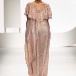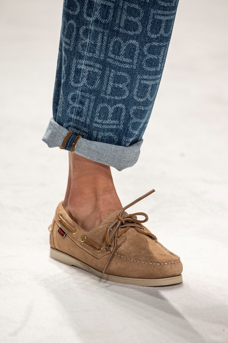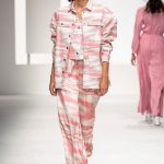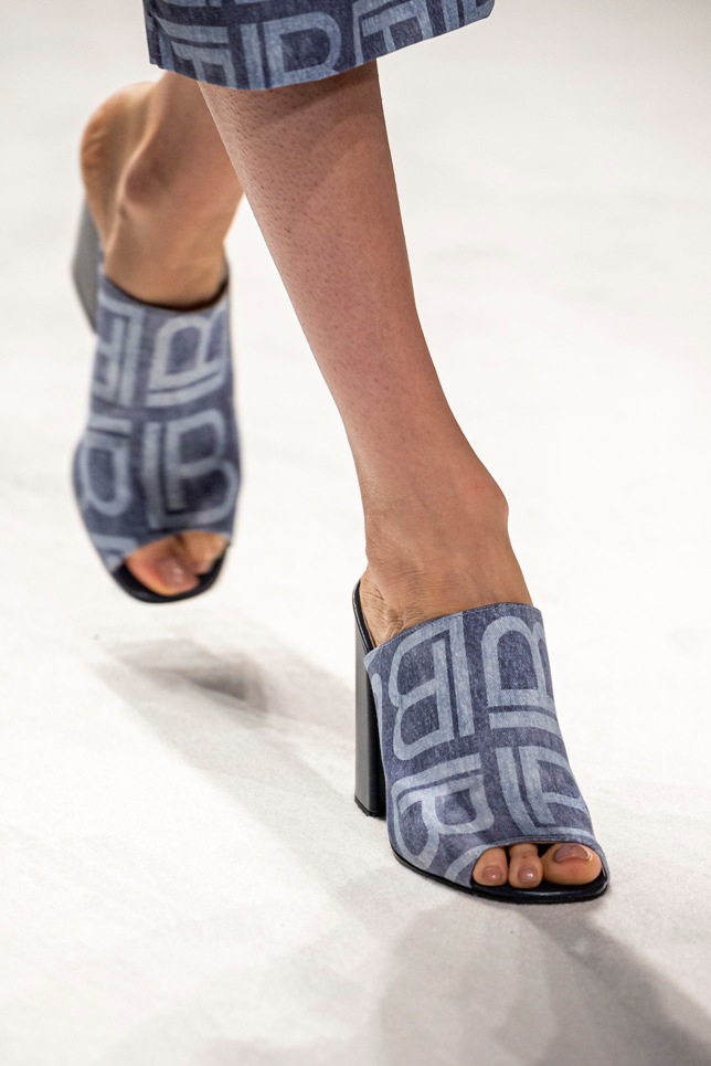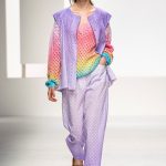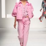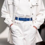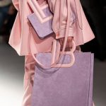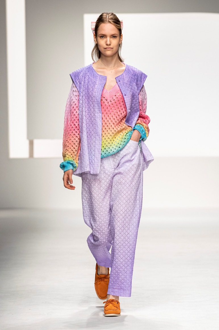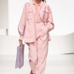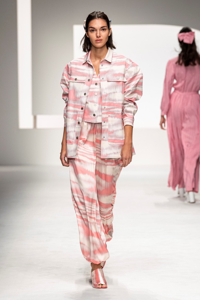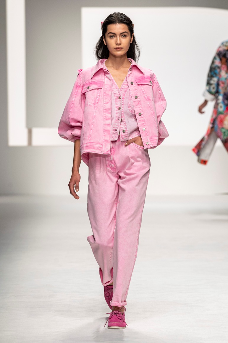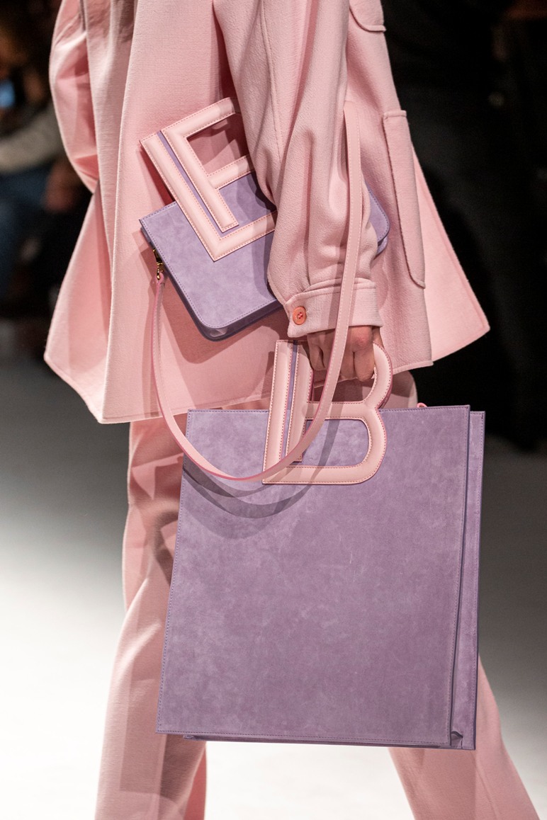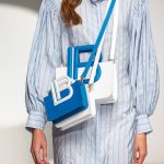 Il logo LB, stampato sulle tele anche denim e riprodotto sugli accessori (cinture e scarpe), fino a trasformarsi nel manico della borsa, è uno dei fili conduttori della collezione. I colori vanno dal bianco al giallo, al fuxia, all’arancio ma prevalgono le tonalità pastello anche sfumate che accentuano la leggerezza degli abiti. L’ultima uscita, un leggins e top iridescente indossato da Anna Cleveland trasporta al futuro dei tessuti luminosi e iridescenti.
